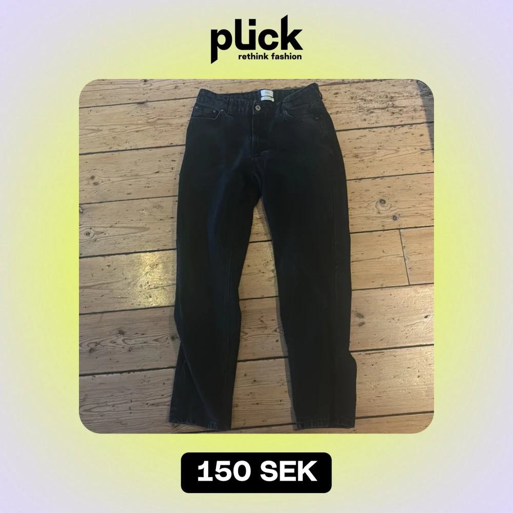 Säljer ett par svarta jeansbyxor i bra skick. De har en klassisk femficksdesign och knappgylf. Perfekta för både vardag och fest. Passar till allt och är superbekväma!