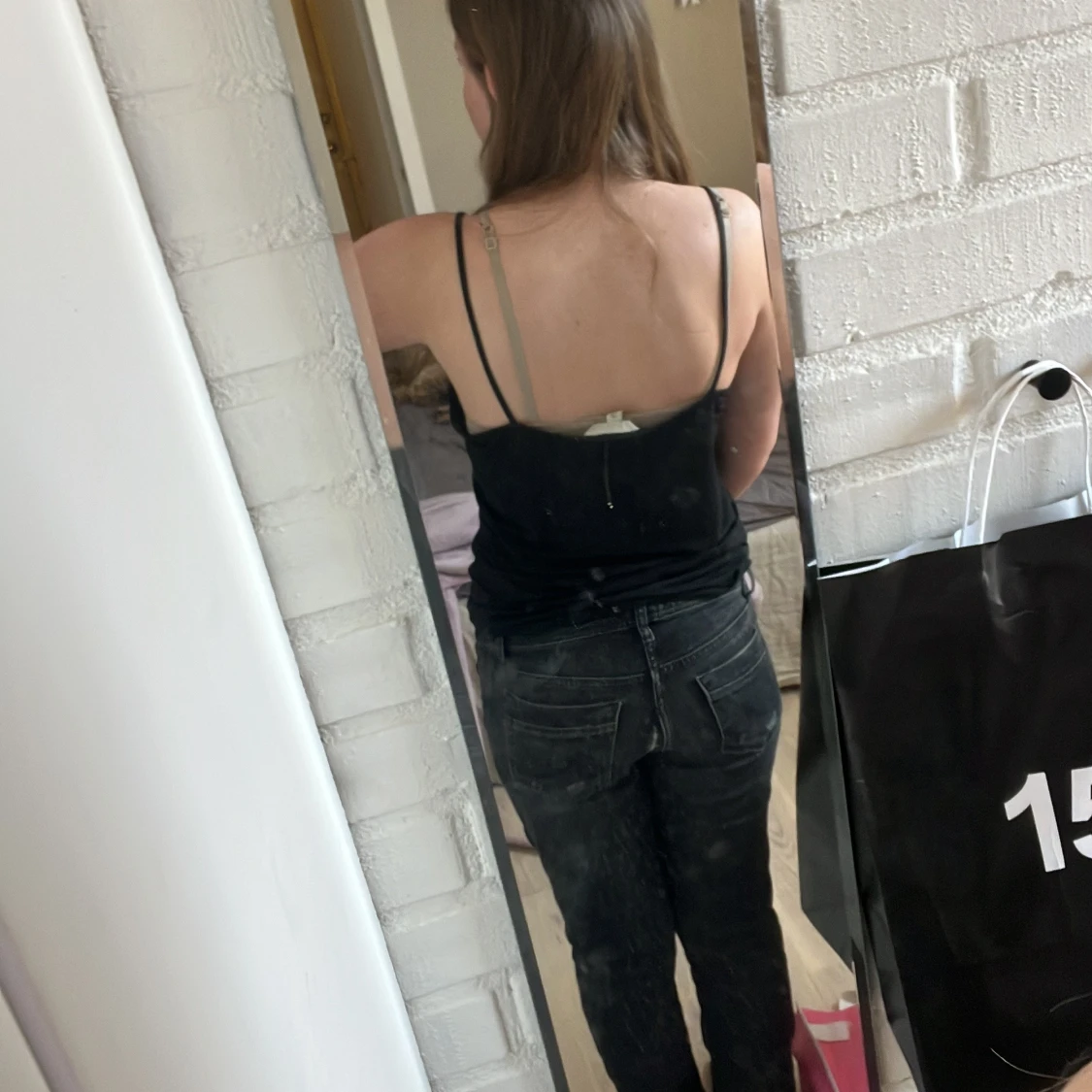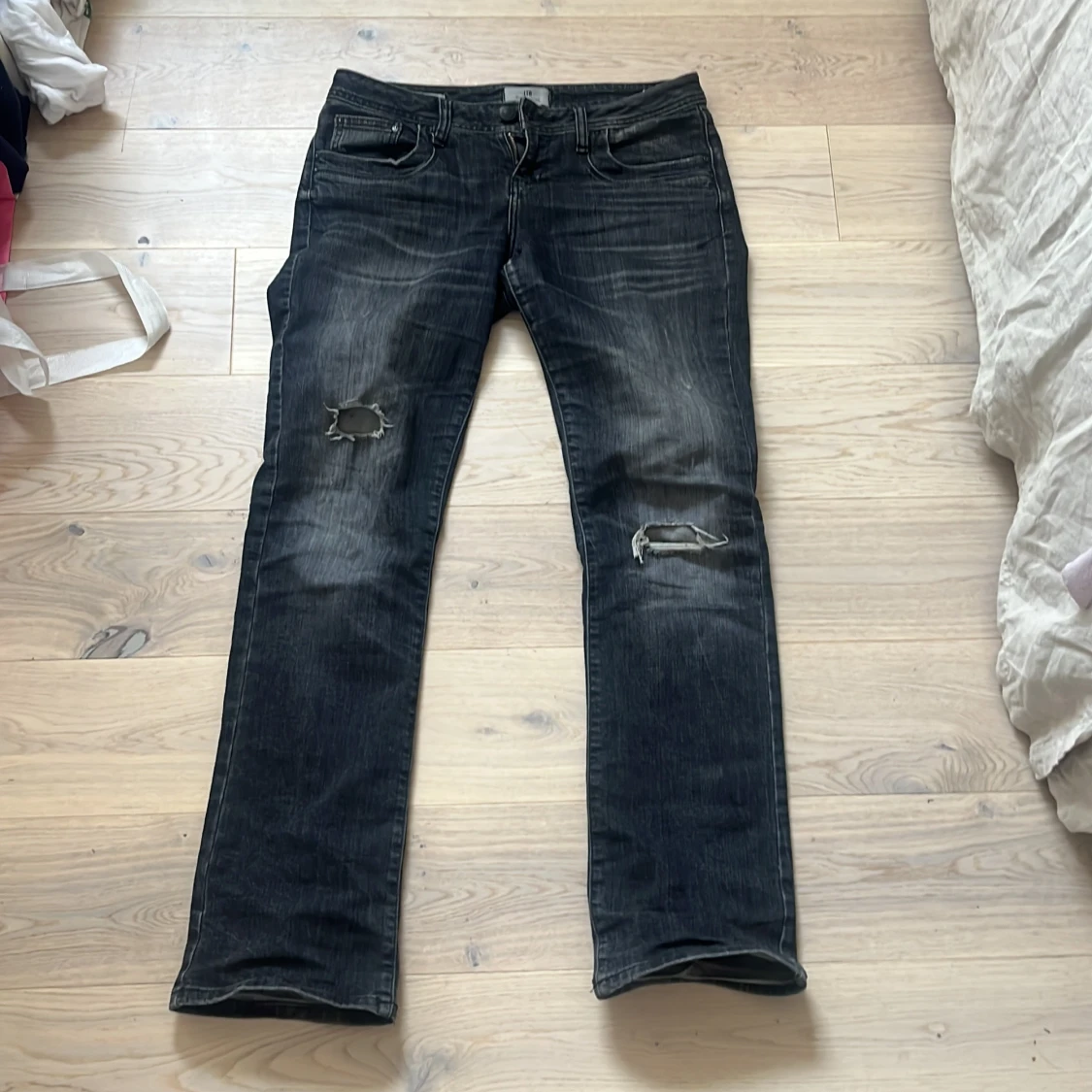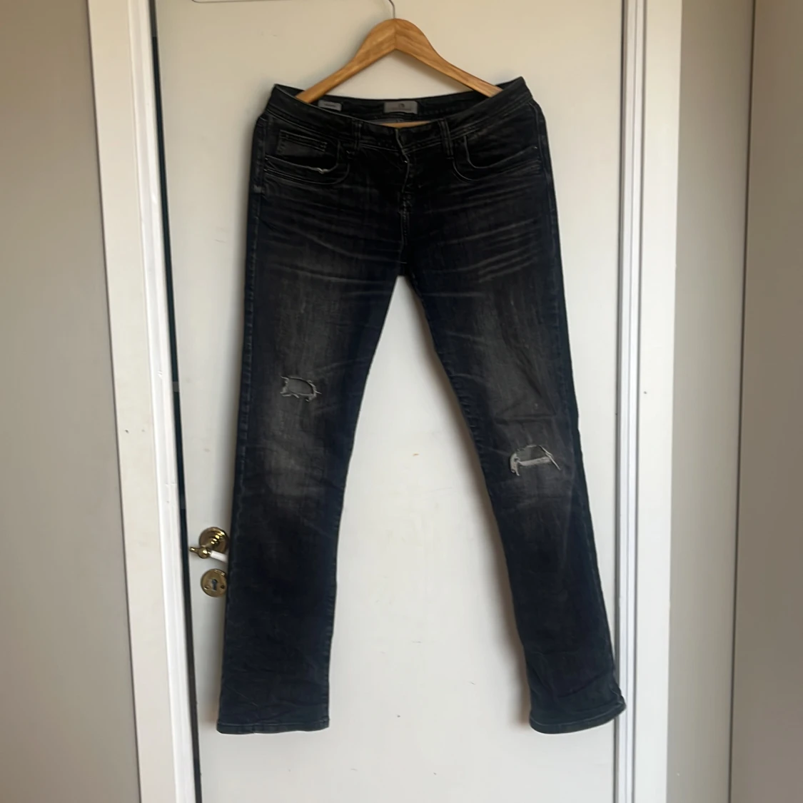 Säljer ett par svarta jeansbyxor med slitningar på båda benen. Byxorna har ett liten hål i rumpan men det går enkelt att laga själv, jeansen är low waist och boot cut💞