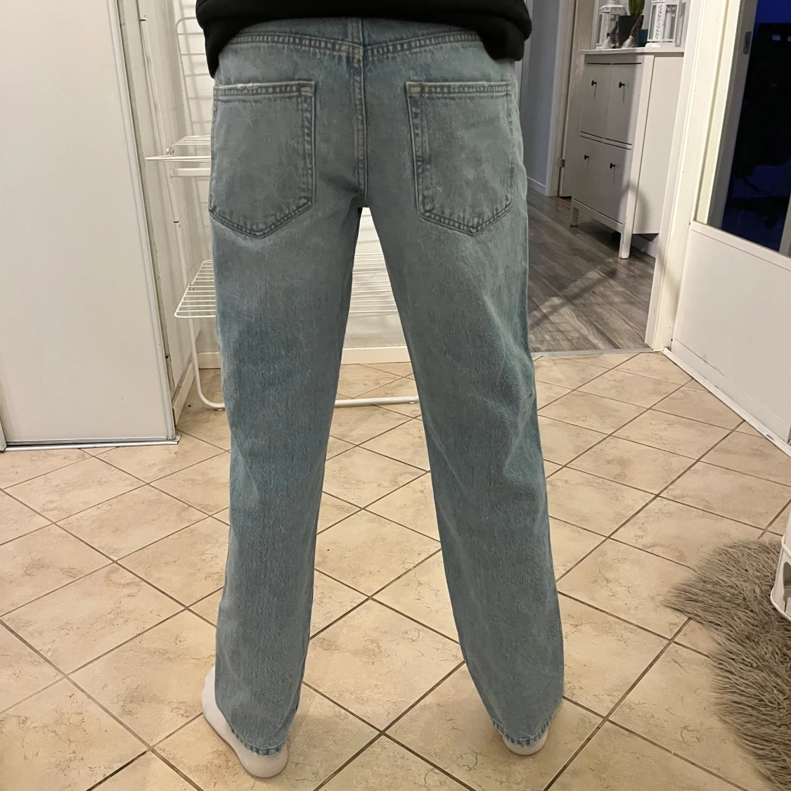 Säljer ett par ljusblå jeansbyxor med en straight passform. Byxorna har en klassisk design med fem fickor och knappgylf. Perfekta för en avslappnad stil. Använda bara en gång så fint skick!
