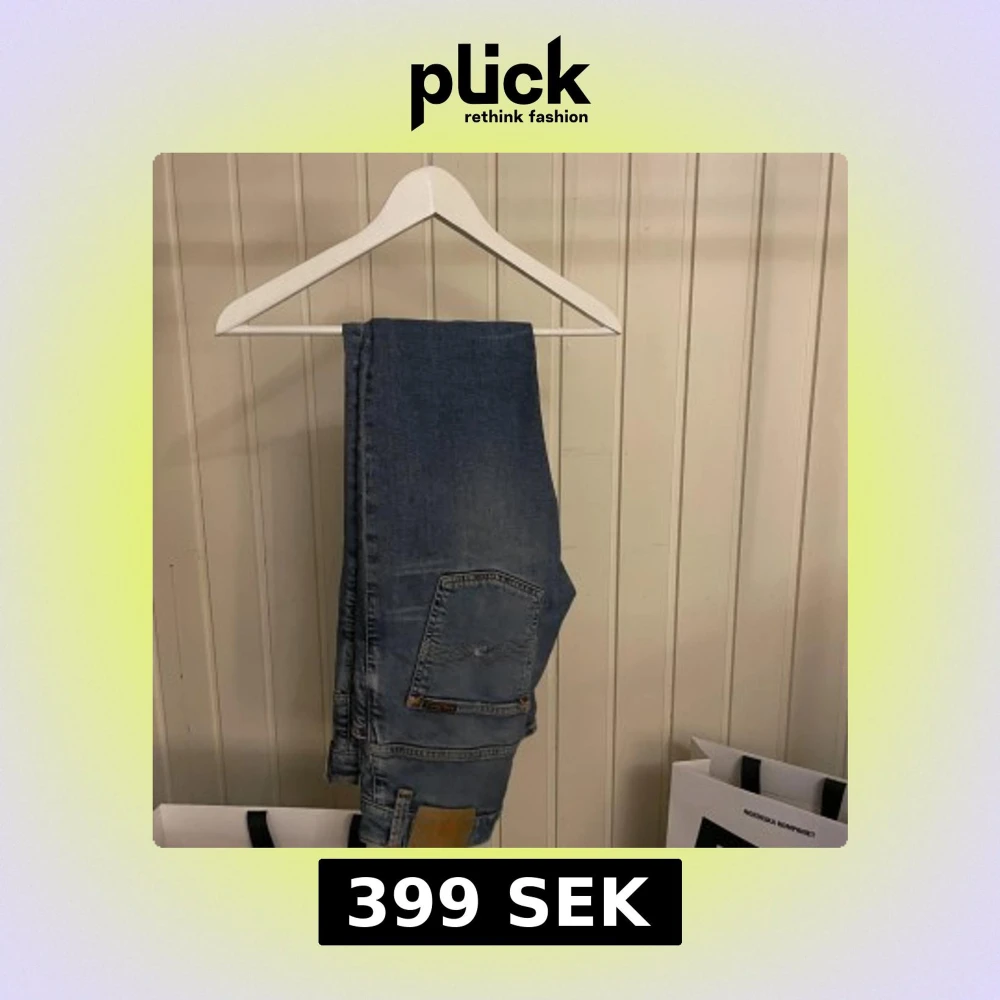Säljer ett par klassiska blå jeans från Nudie Jeans Co med snygga slitningar och kontrastsömmar i orange. Jeansen har fem fickor, tydlig logga på bakfickan och knapp med märkets namn. slitningarna har konvorterars till hål. Perfekt för dig som gillar en tidlös denimlook.