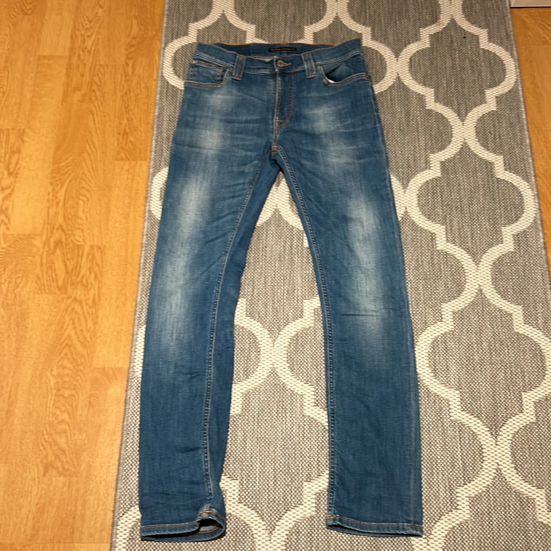 Säljer ett par snygga blå jeans från Nudie Jeans. De har en klassisk femficksdesign med orange sömmar och en knappgylf. Perfekta för en avslappnad stil. Modellen är grim tim, vilket är slimfit köpte dessa för 900 men de va för stora så jag säljer dem. Skriv under minsta fundering😊.