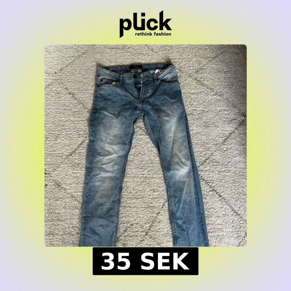 Säljer ett par snygga blå jeans från Smog. De har en klassisk femficksdesign och en knappgylf. Perfekta för en avslappnad stil. Storlek 29/32.