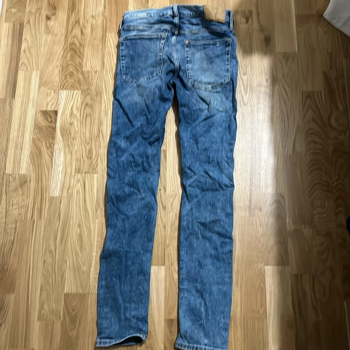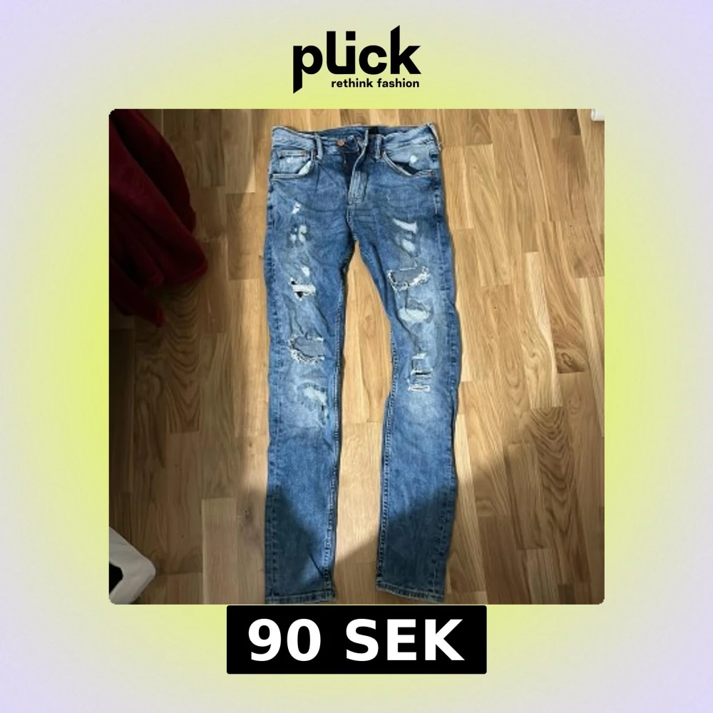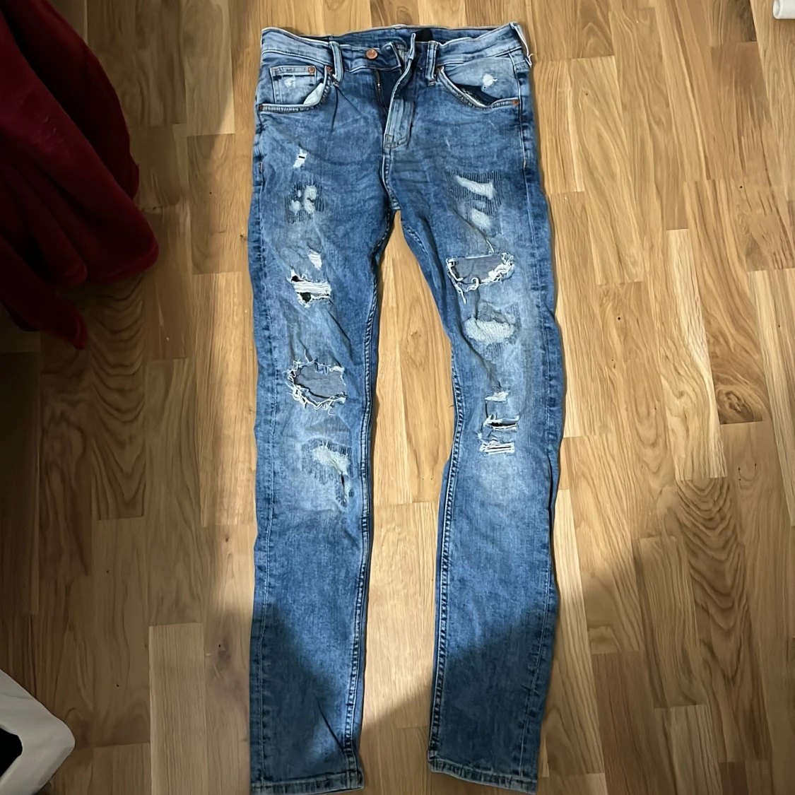 Säljer ett par blå super skinny jeans från &Denim med slitna detaljer och hål framtill. Jeansen har klassisk femficksdesign, låg midja och är tillverkade i stretchig denim för en tajt passform. Perfekta för dig som gillar en edgy streetstil.