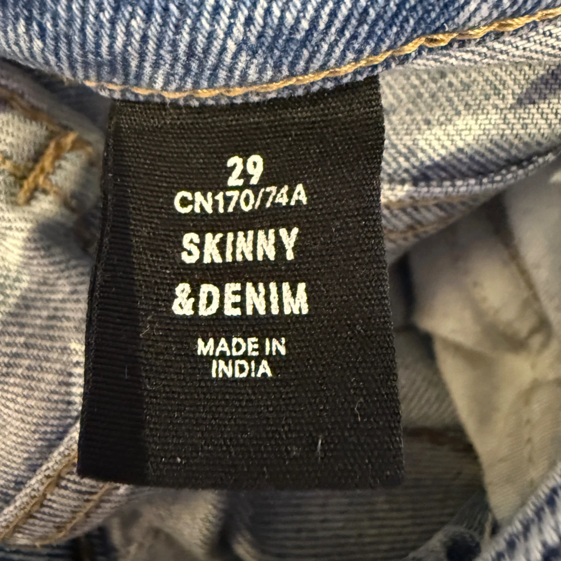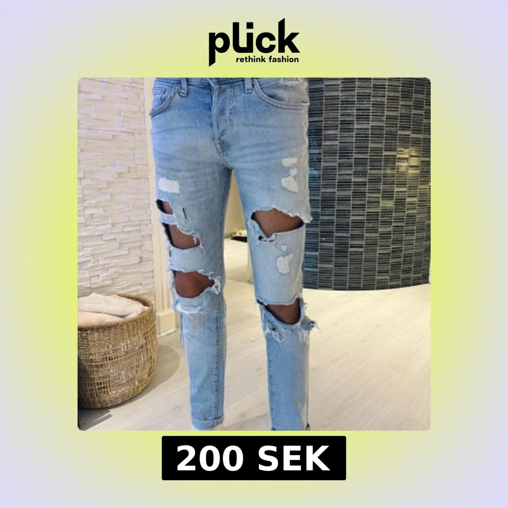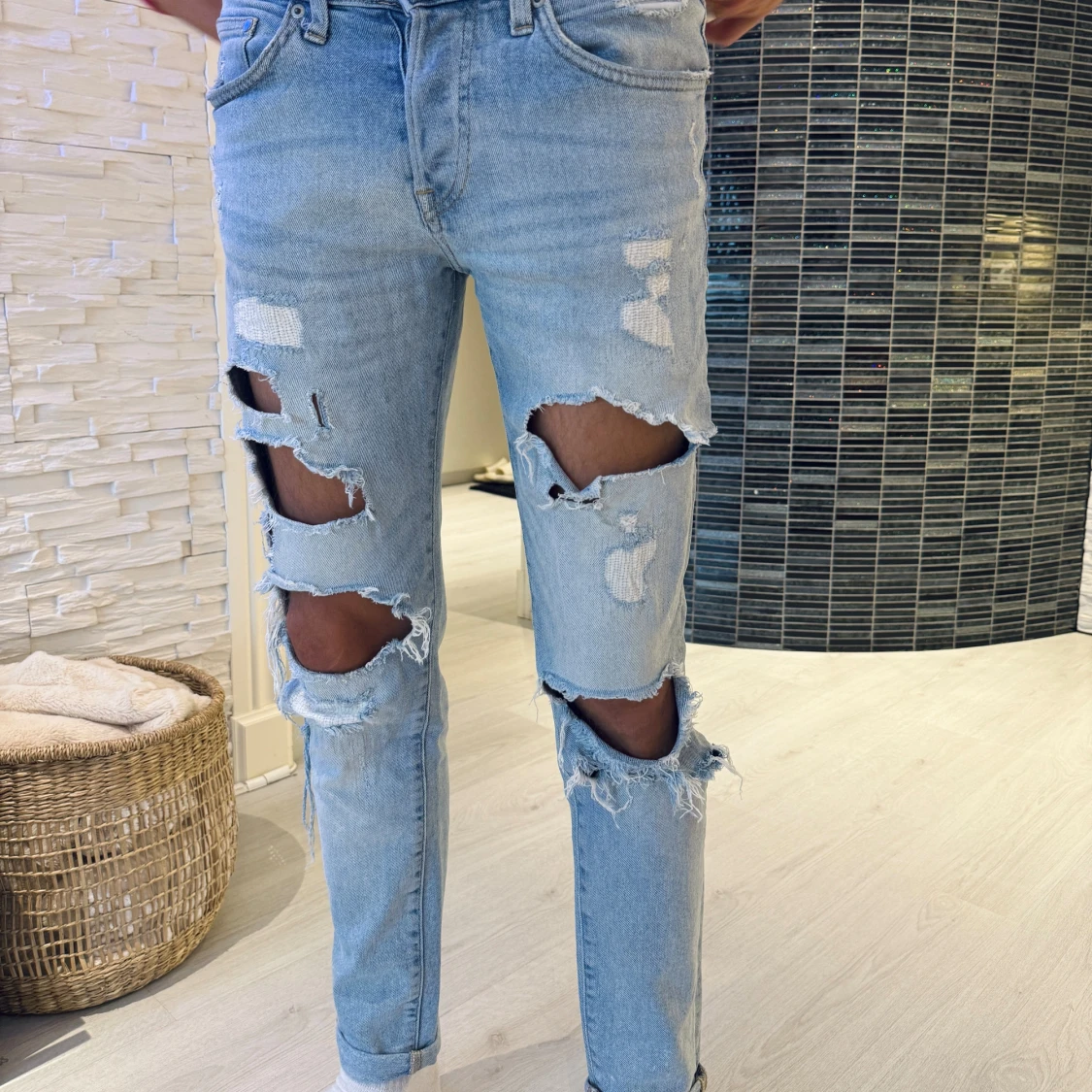 Riktigt snygga ljusblå skinny jeans med stora slitningar och hål framtill på båda benen. Jeansen har klassisk femficksdesign och är tillverkade i denim. Perfekta för dig som gillar en edgy och trendig look.