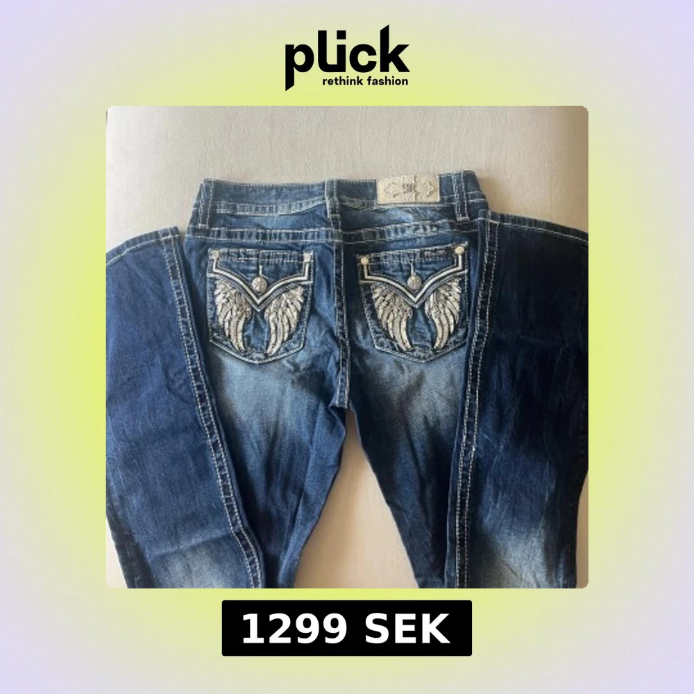 Snygga blå Miss Me low bootcut jeans med coola broderade fickor med vingar bak. Tydliga kontrastsömmar och klassisk bootcut passform. Jeansen har låg midja och är gjorda i stretchig bomullsdenim för en bekväm känsla. Innerbenslängd: 84cm Midjevidd: 37,5cm Totallängd: 112,5cm Benvidd nedtill: 23cm