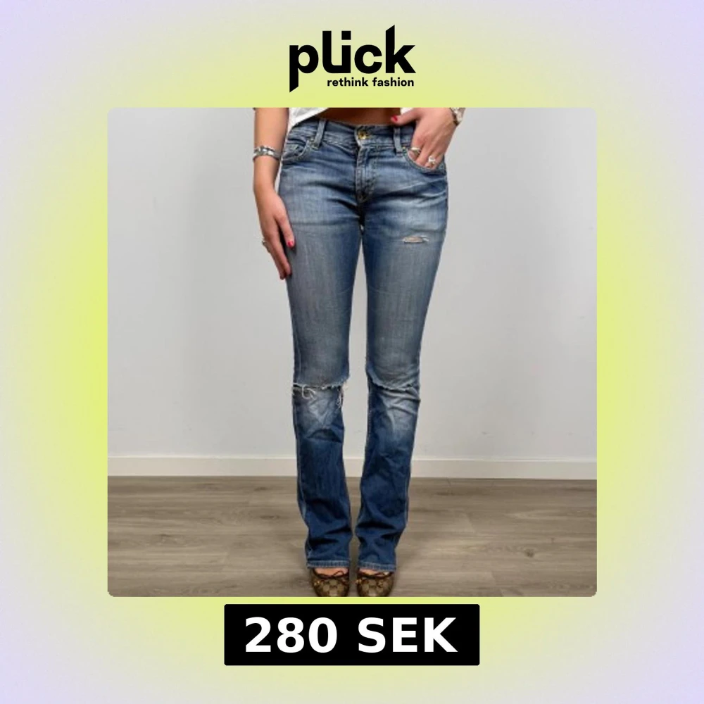 Snygga blå jeans med bootcut passform och slitna detaljer vid knän och bakfickor. Jeansen har klassisk femficksdesign, låg midja och är tillverkade i denim. ⚠️Jeansen har hål på rumpan vid fickorna, vilket gör dom unika!!