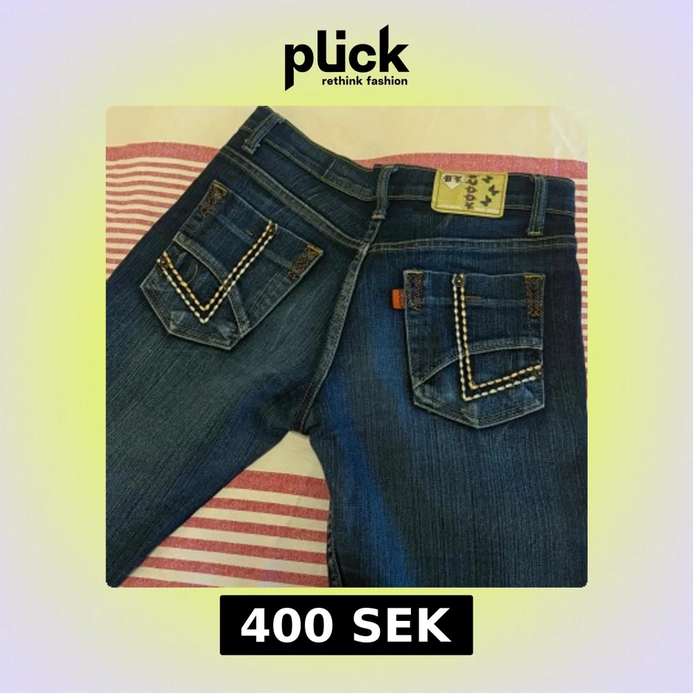 Säljer ett par mörkblå jeans med snygga broderade detaljer på bakfickorna. Bootcut passform. Storlek 29, vet tyvärr inte långt men passar mig som är 170cm. Knappt använd.