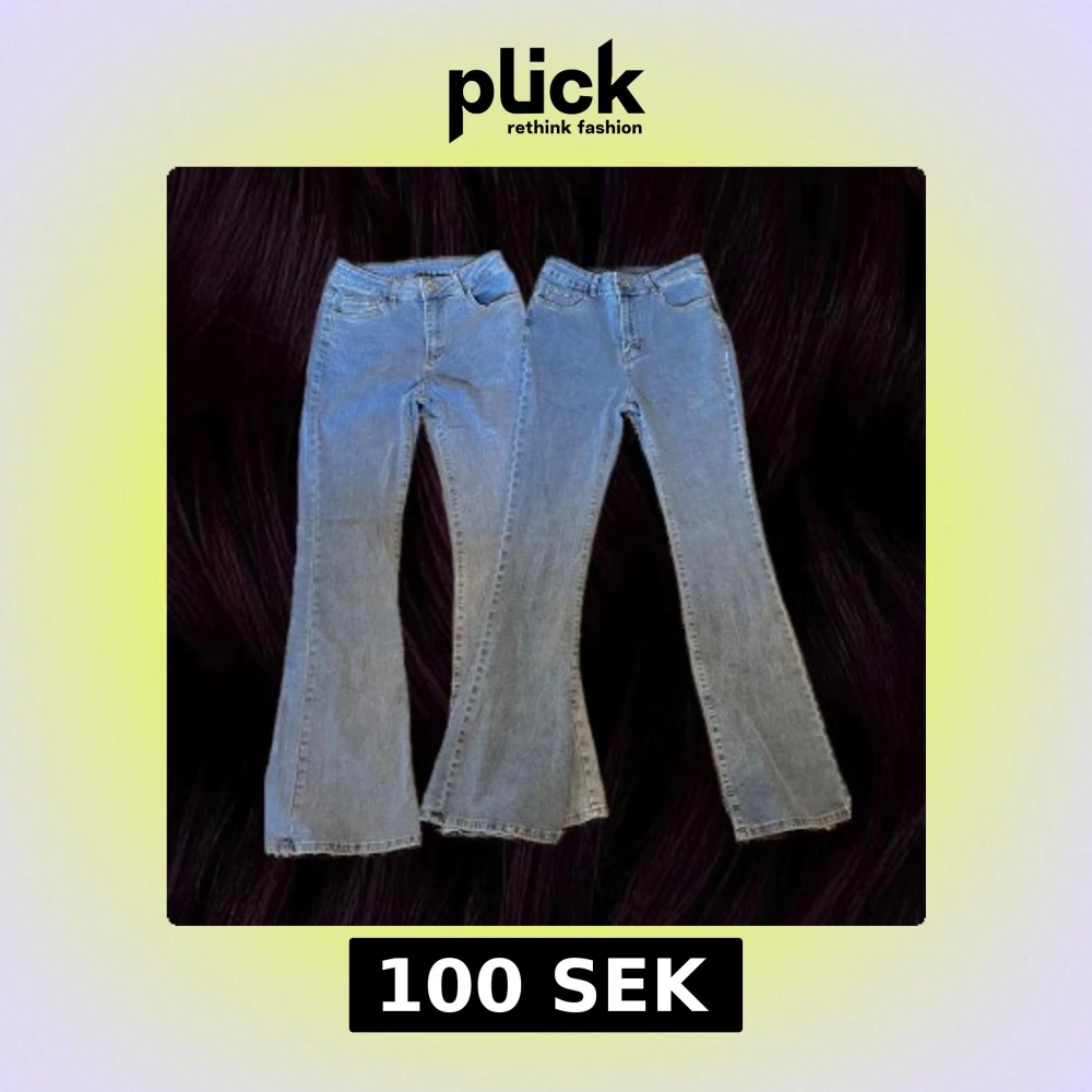 Från SHEIN, säljer båda tillsammans. Båda är storlek M och har innerbenslängden 81 cm. Midjehöjden är 27cm (high rise). Höfter är 42 cm. Materialet är stretchigt och jeansen är två olika nyanser (se bild 2). ⚠️⚠️Eftersom de aldrig är använda har de en kemikalsk lukt som förhoppningsvis försvinner efter ett par tvättar