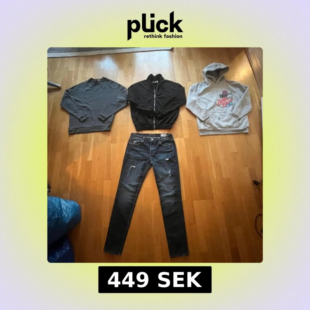 Tja! Jag säljer en bundle för dig som är mellan 170-180 som innehåller 3 hoodies och ett par jeans. Allt är i mycket bra skick det går att köpa endast en vara också men hela bundeln kostar 449 kr. Jeansen är från crocker, grå hoodie från boohoo man, full zip från weekday, grå tröja från asos design. Perfekt för resellers också då nypris på allt är 1800