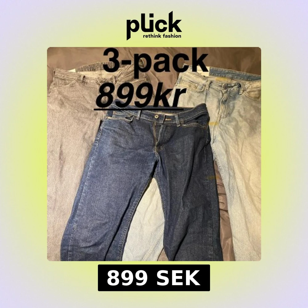 Säljer ett 3-pack jeansbyxor i olika nyanser av blått. Ett par är mörkblå, ett par ljusblå och ett par grå. Perfekta för en avslappnad stil. Alla byxor har klassisk femficksdesign. Ett par av mcgordon (org pris ca 700kr, mörkblåa) går att köpa separat *