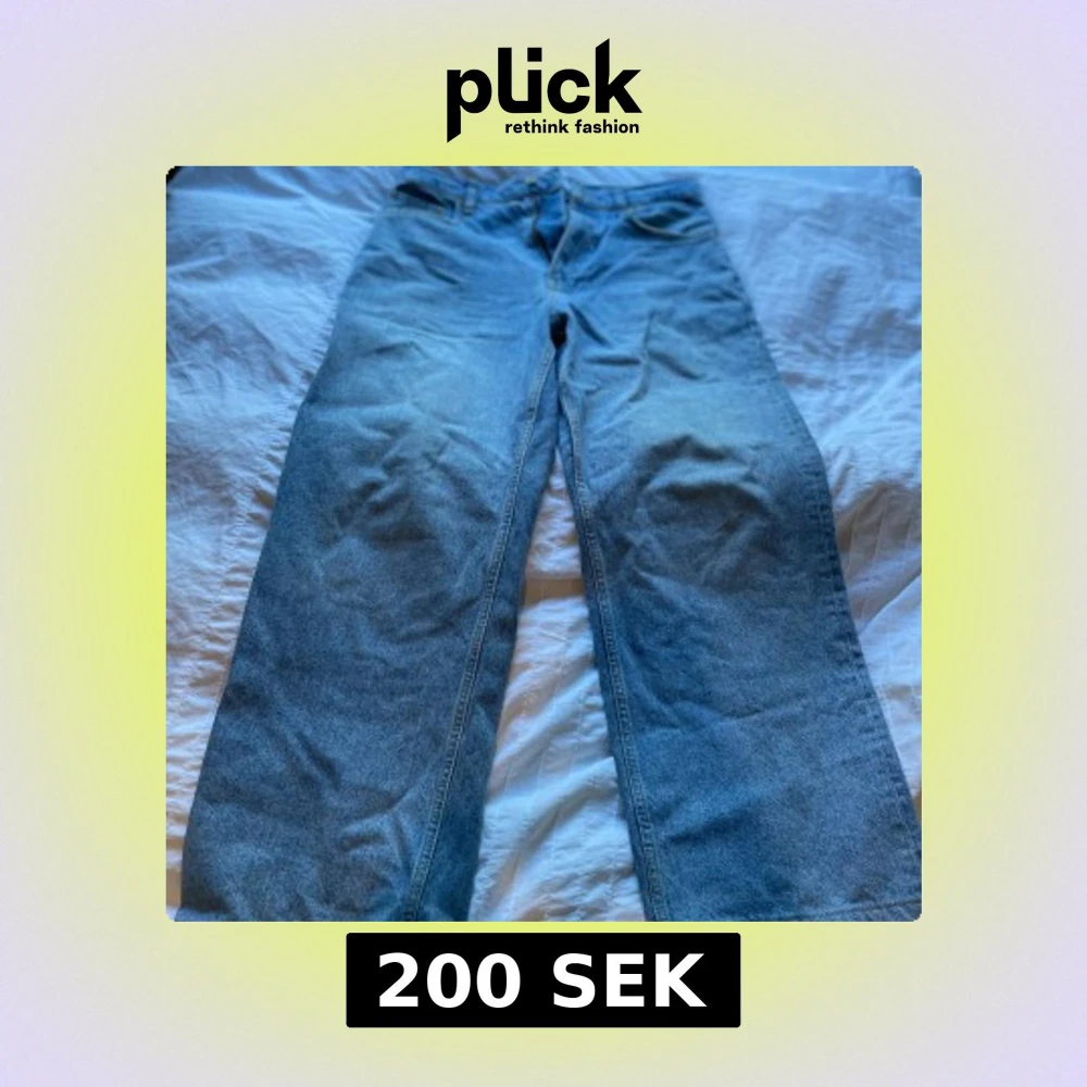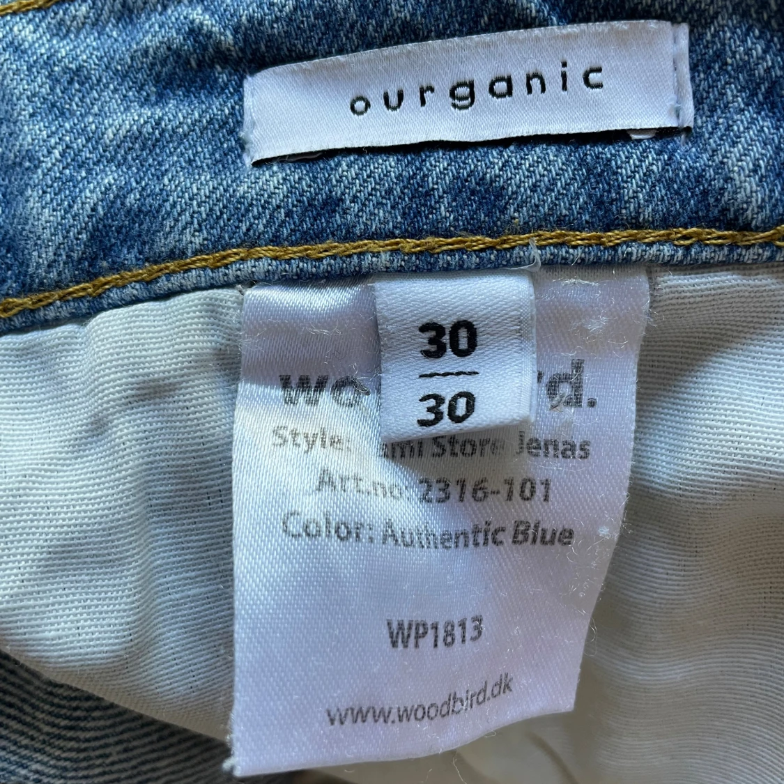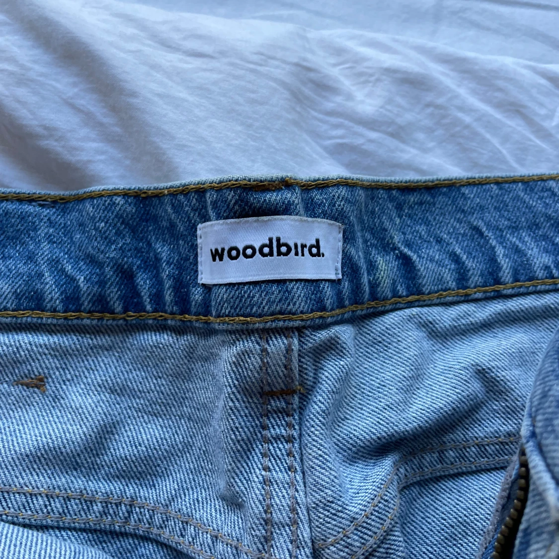 Säljer ett par klassiska blå jeans från Woodbird i modellen 'Slim Store'. Jeansen har en rak passform och är tillverkade i autentiskt blått denimtyg av bomull. Perfekta för dig som gillar en enkel och stilren look.