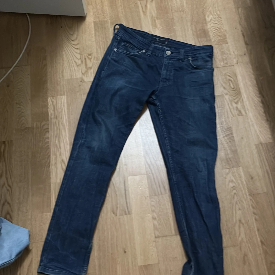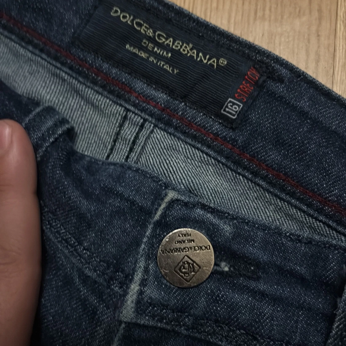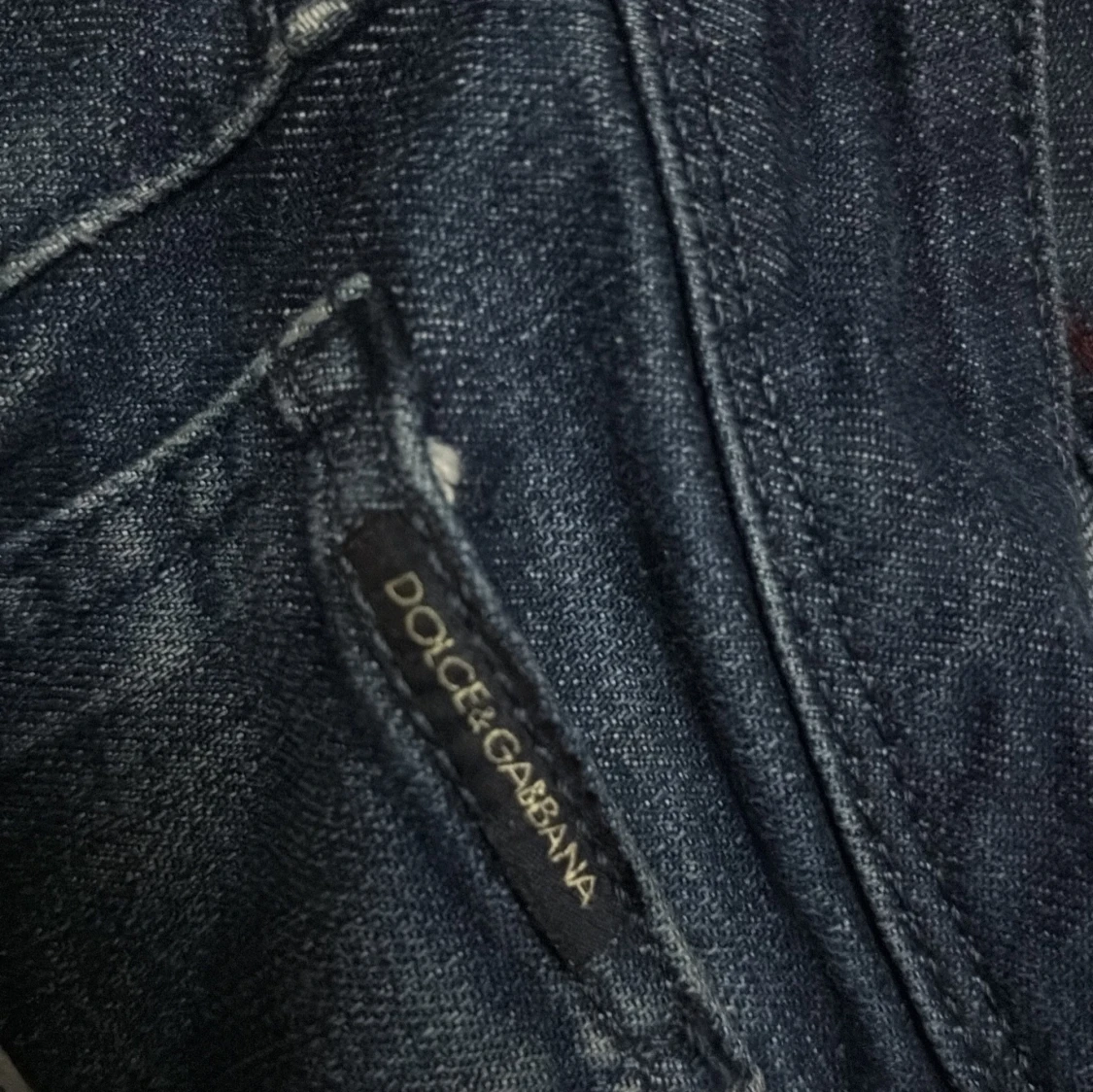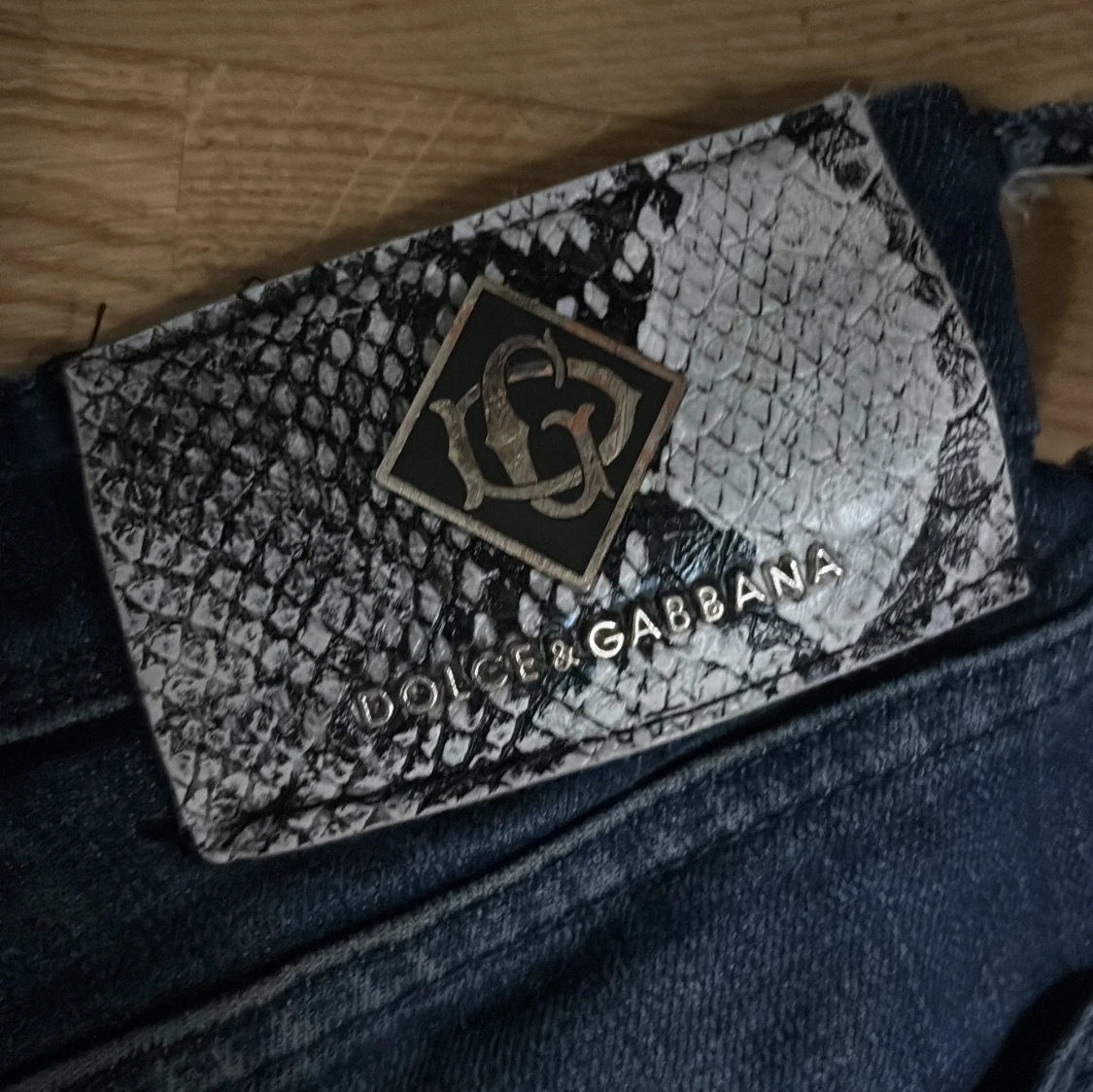 Snygga blå jeans från Dolce & Gabbana med klassisk femficksdesign och en unik patch i ormskinnsmönster med metallogo bak. Jeansen har smal passform och är tillverkade i denim med stretch för extra komfort. Perfekta för dig som vill sticka ut med exklusiva detaljer. Den passar it mig så jag tänkte sälja den