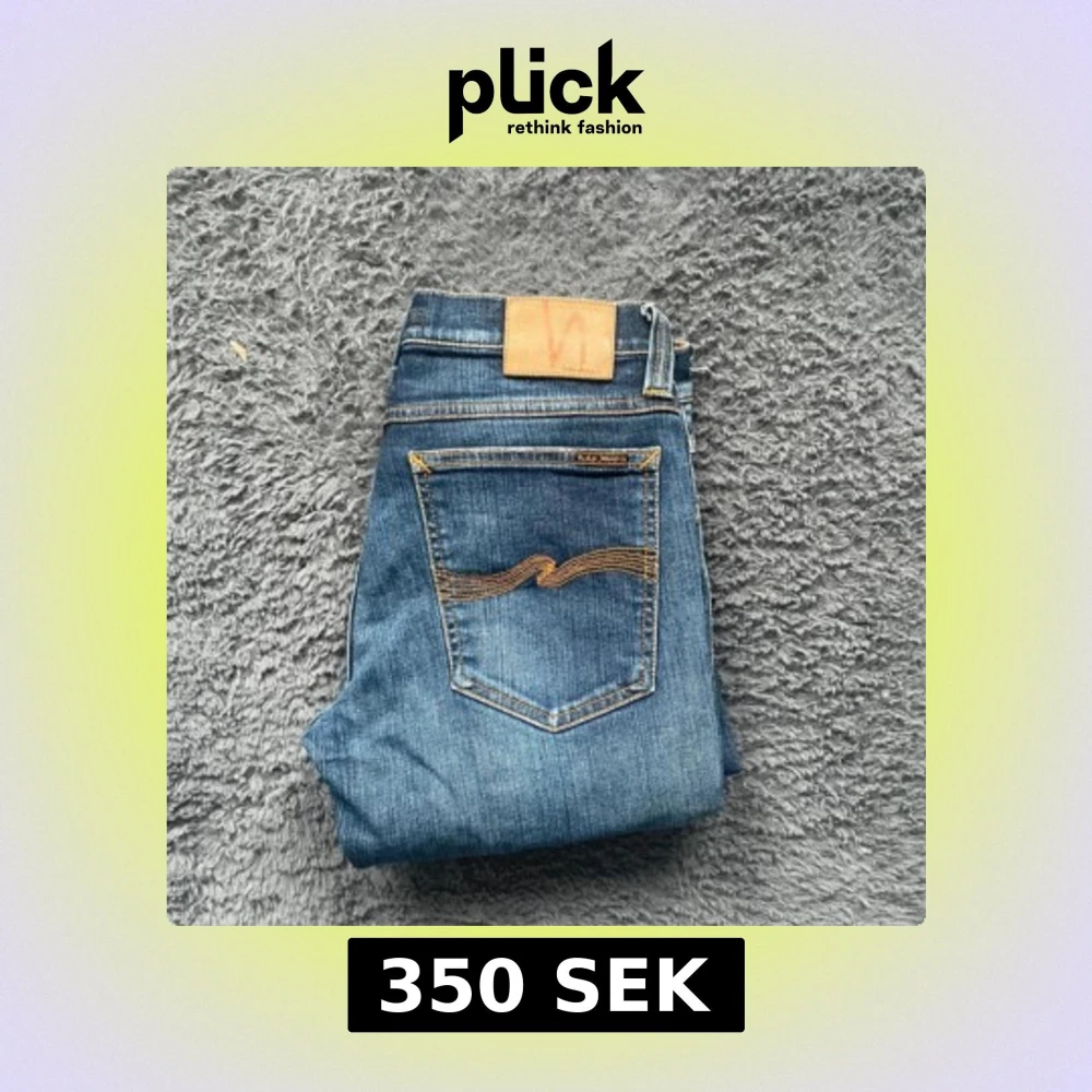 Säljer ett par klassiska blå jeans från Nudie Jeans med snygga kontrastsömmar och ikonisk broderad bakficka. Modellen har raka ben och normal passform, perfekt för dig som gillar stilrena jeans med en modern touch. Skicket är 8/10
