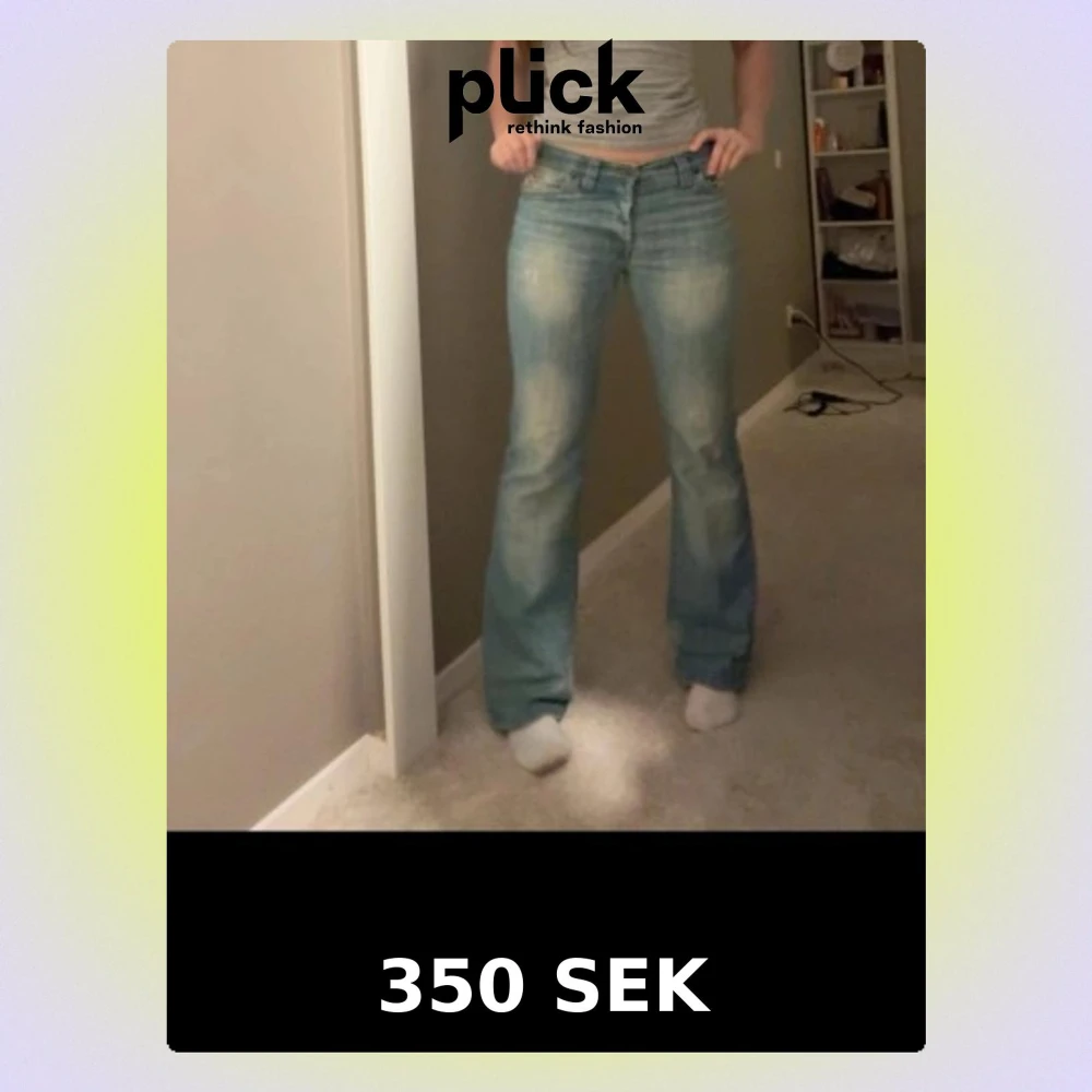 Säljer ett par ljusblå bootcut jeans med snygga slitningar och tvättade detaljer. Jeansen har klassisk femficksdesign, låg midja och är tillverkade i jeansmaterial med en skön passform. Perfekt för dig som gillar retrovibbar och vill ha ett par jeans som sticker ut.