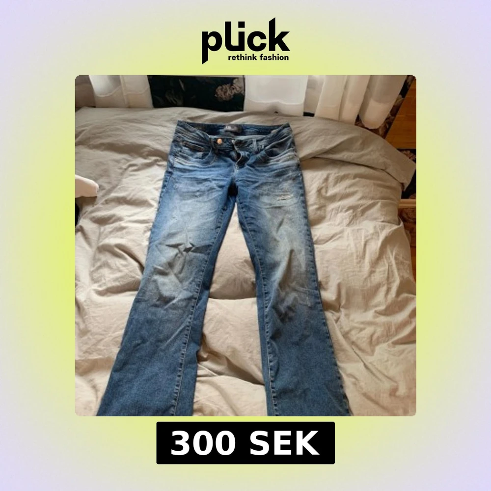 Snygga blå bootcut jeans från LTB, modell Valerie. Jeansen har lågmidja. Men de va förstora på mig så jag har satt dit en extra knapp så nu skulle jag säga att de passar en med storleken 29/32-28/32
