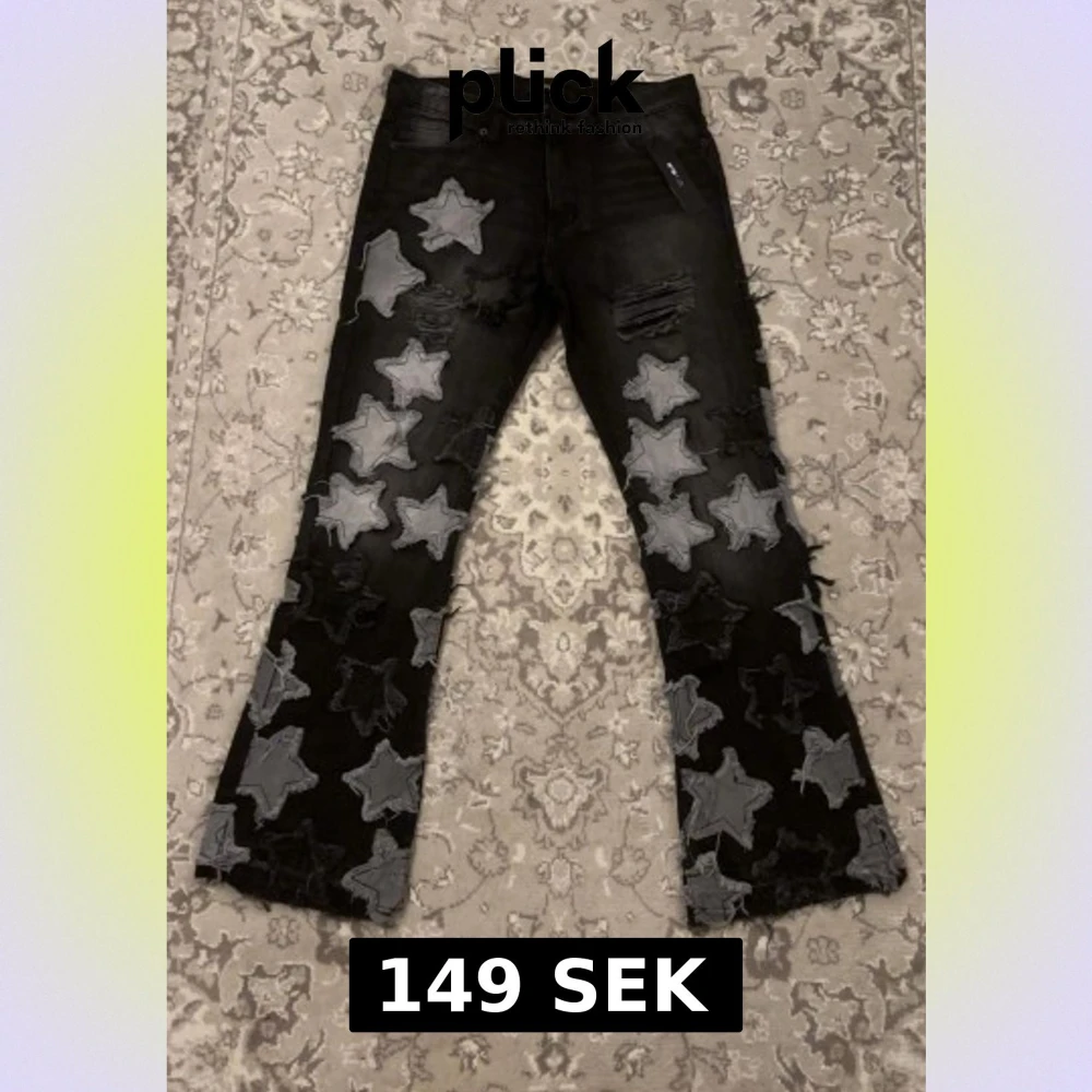 Säljer ett par svarta Fashion Nova-jeans med unik stjärndesign. Jag köpte dem men har aldrig hunnit använda dem då jag jobbar konstant. Därför tänker jag att någon annan får bättre nytta av dem än att de bara ligger hemma. Jeansen är helt nya, aldrig använda och har fortfarande originallappen kvar. Modellen har distressed detaljer och stilrena gråa stjärnpatches både fram och bak. Perfekta för dig som gillar statement-jeans och streetwear. Kan hämtas eller skickas.