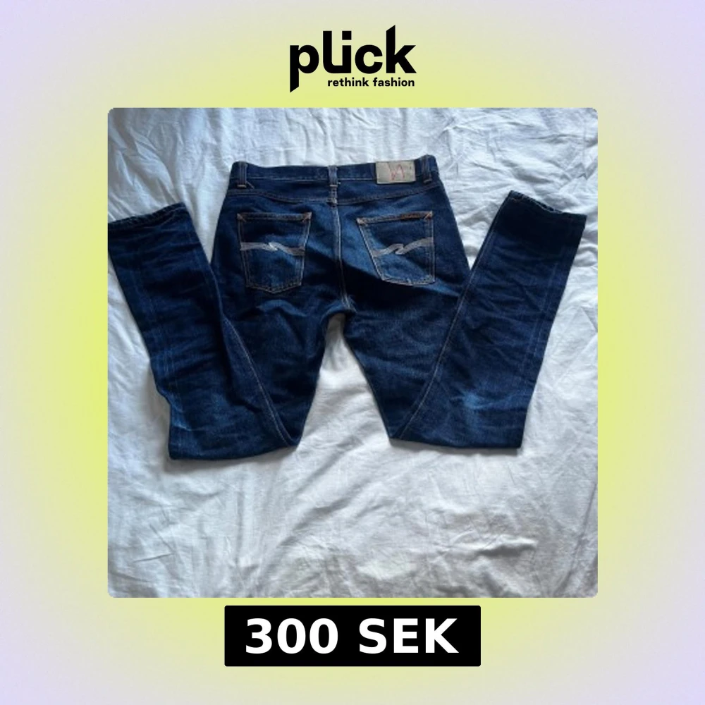 Säljer ett par mörkblå jeans från Nudie Jeans, modellen Lean Dean. Jeansen har klassisk femficksdesign, orangea sömmar och raka ben. Tillverkade i 99% ekologisk bomull och 1% elastan för lite stretch. Storlek W30 L34.