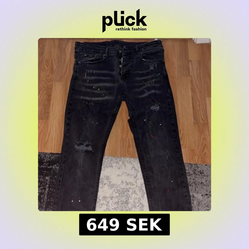 Snygga svarta jeans från Dsquared2 med slitna detaljer och knappgylf. Jeansen har en cool, distressed look med små färgstänk och en röd logotyp på baksidan. Perfekta för en trendig stil. Jeansen är slimfit och är använda några gånger. Jeansen är köpta på hemsidan disquared.