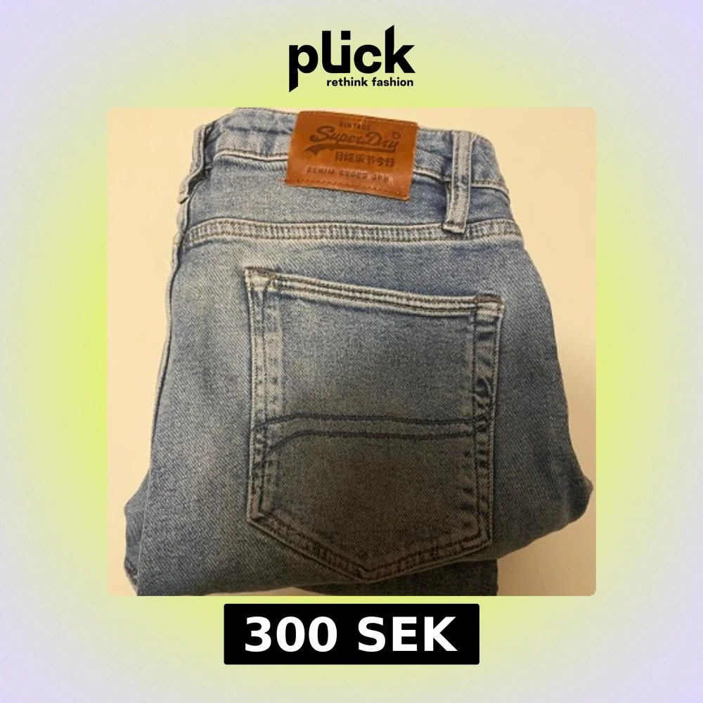 Snygga blå jeans från Superdry med klassisk femficksdesign och läderpatch på baksidan. Perfekta för en avslappnad stil. De har en dragkedja och knapp framtill.
