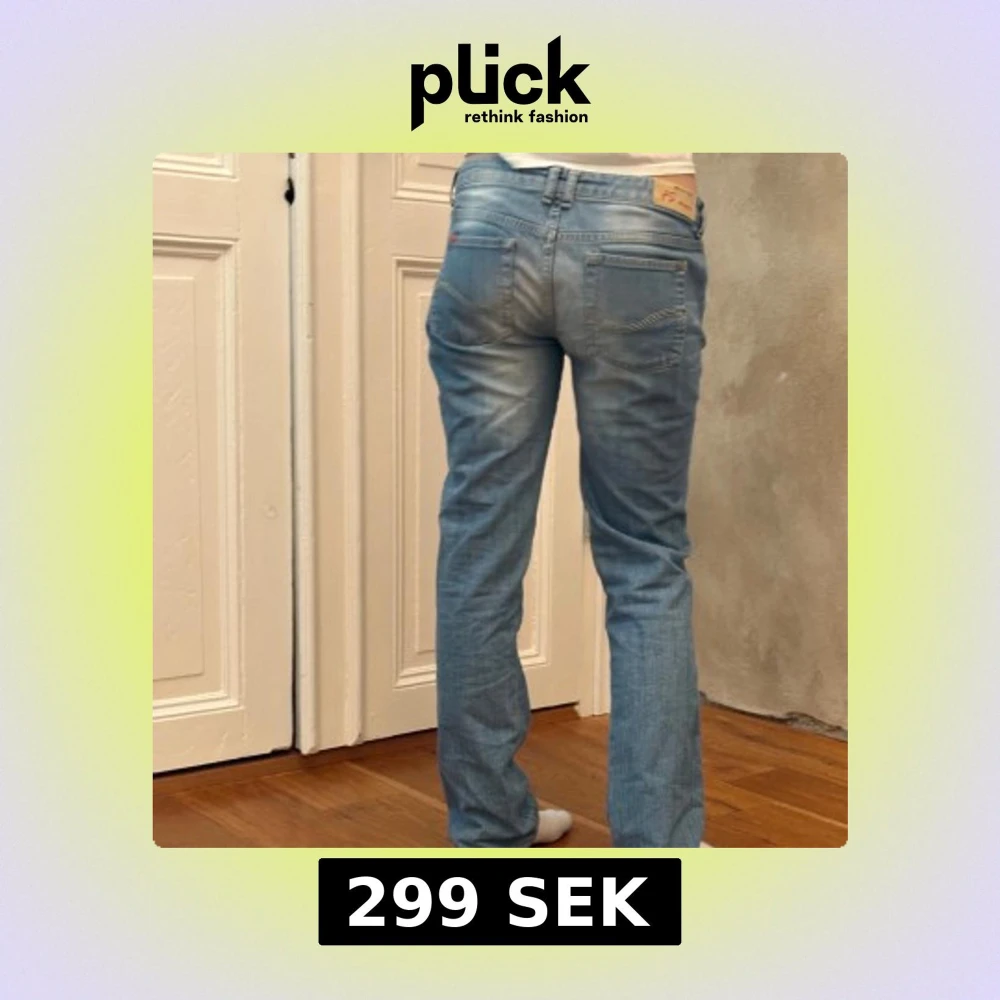 Säljer ett par ljusblå jeansbyxor med klassisk femficksdesign och raka ben. Jeansen har låg midja och subtila slitningar framtill för en avslappnad look. Perfekta för dig som gillar en enkel och stilren denimstil. Midjemått 42