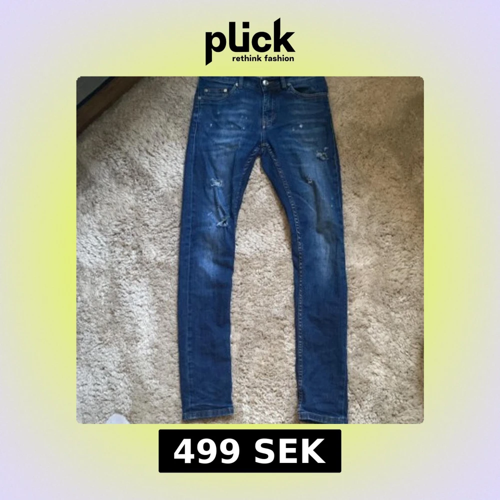 Säljer ett par blå jeans med coola slitningar och lätt tvättad look. Jeansen har klassisk femficksdesign, smal passform och är tillverkade i stretchigt denim för skön känsla. Perfekta för dig som gillar en streetig stil och vill ha jeans med attityd.
