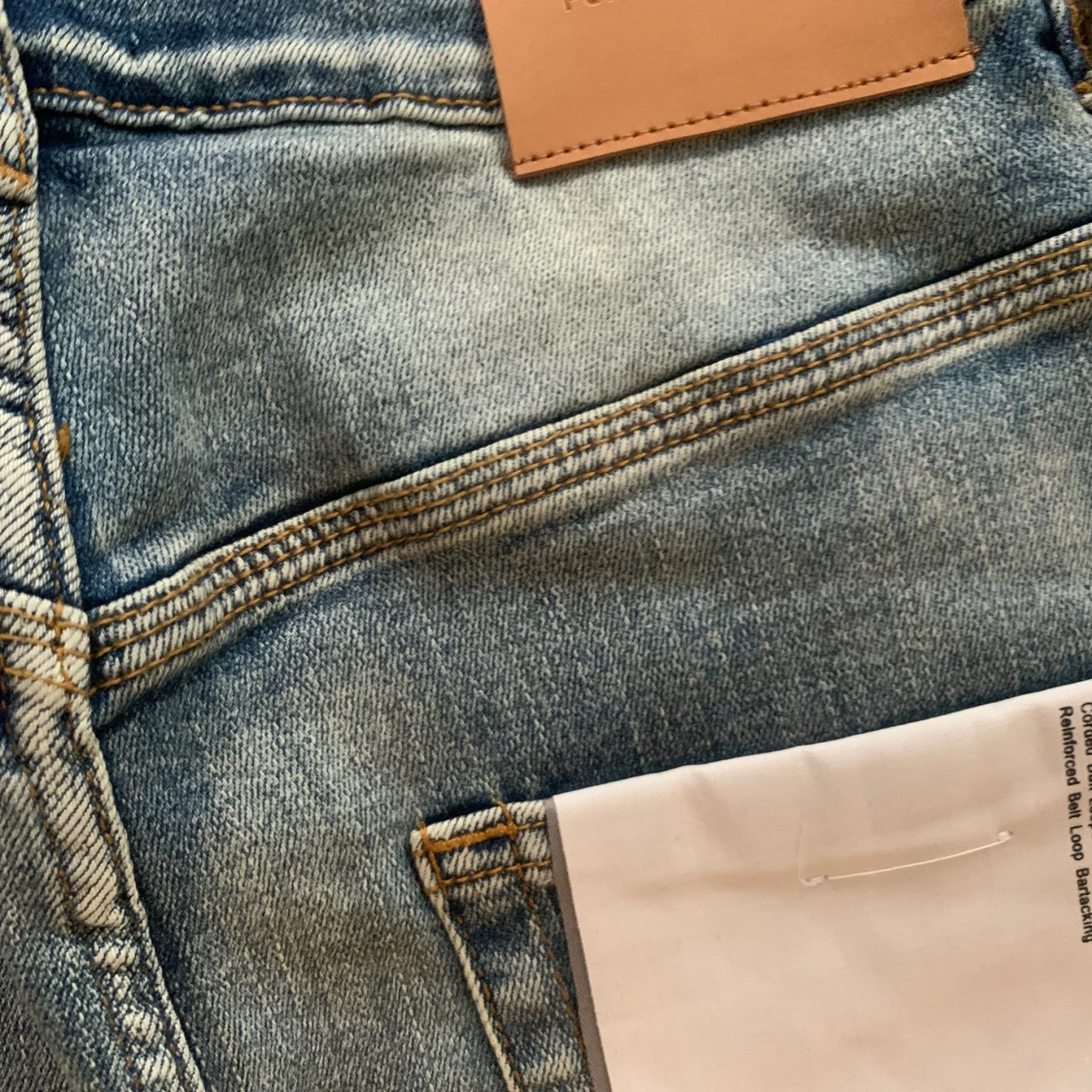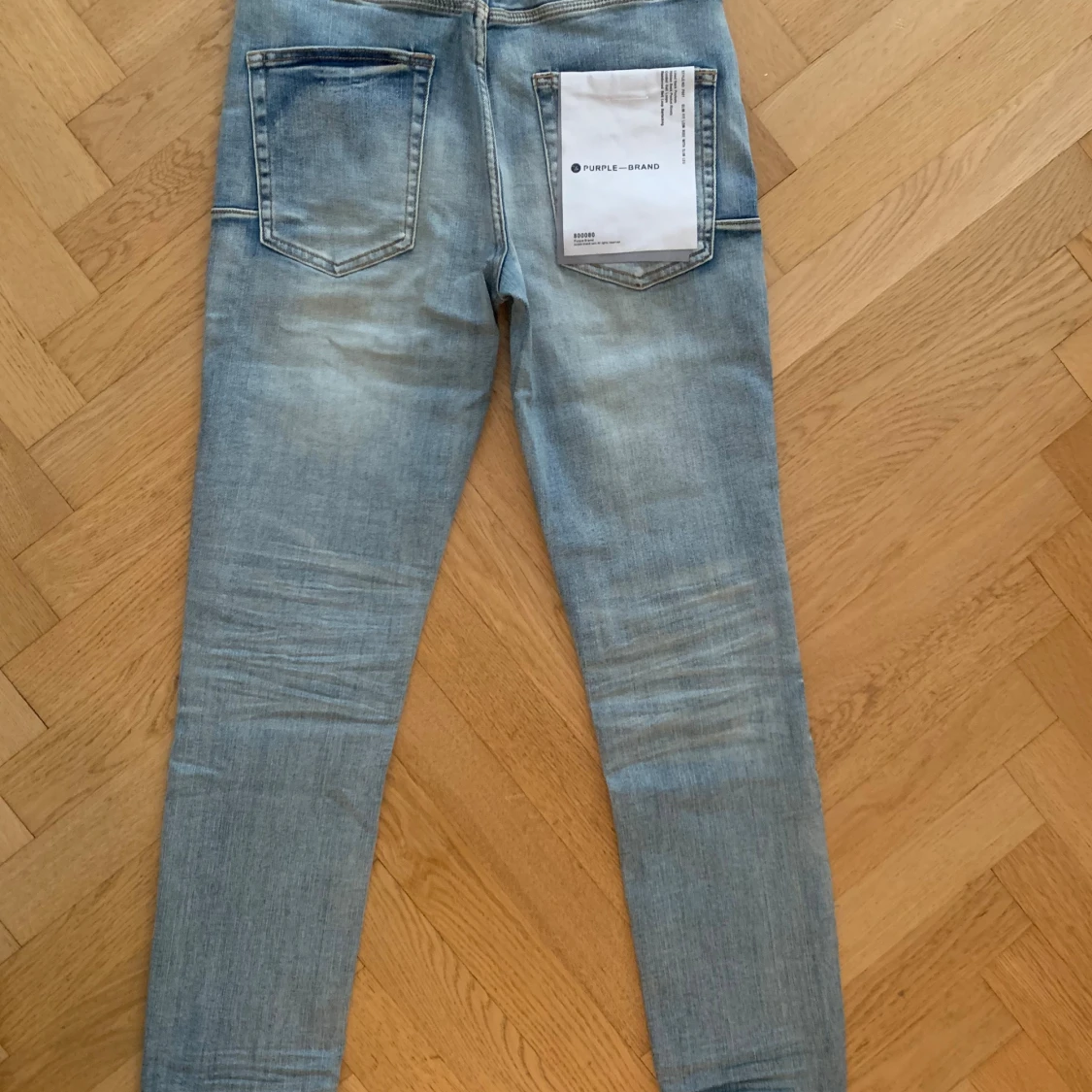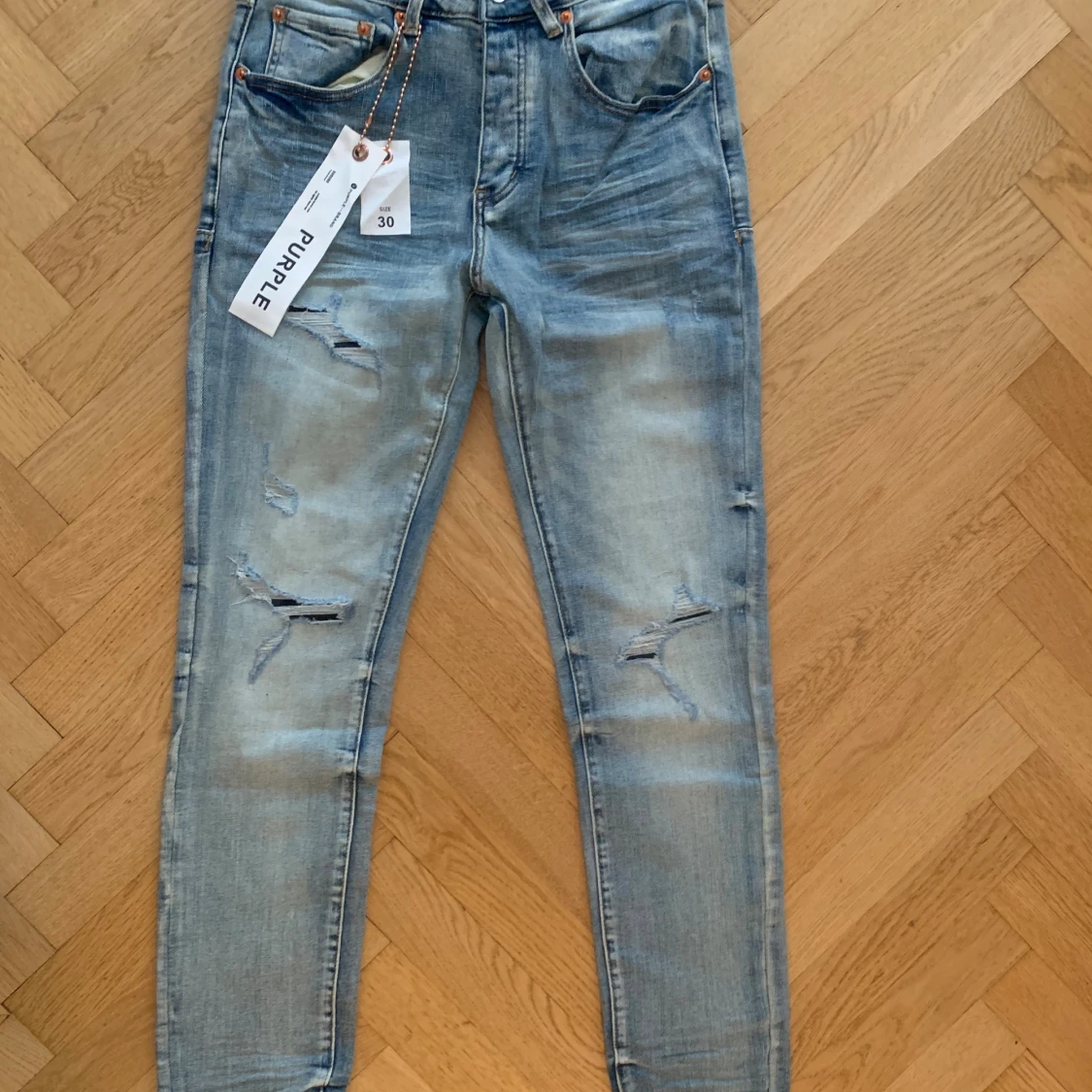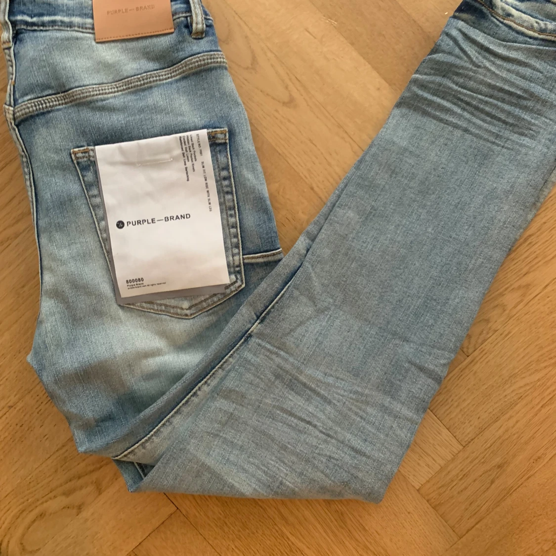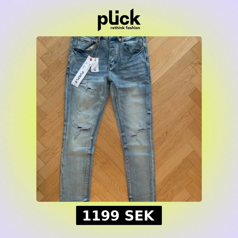 Snygga ljusblå jeans från Purple Brand med slitna detaljer och ripped look på benen. Jeansen har slim passform.