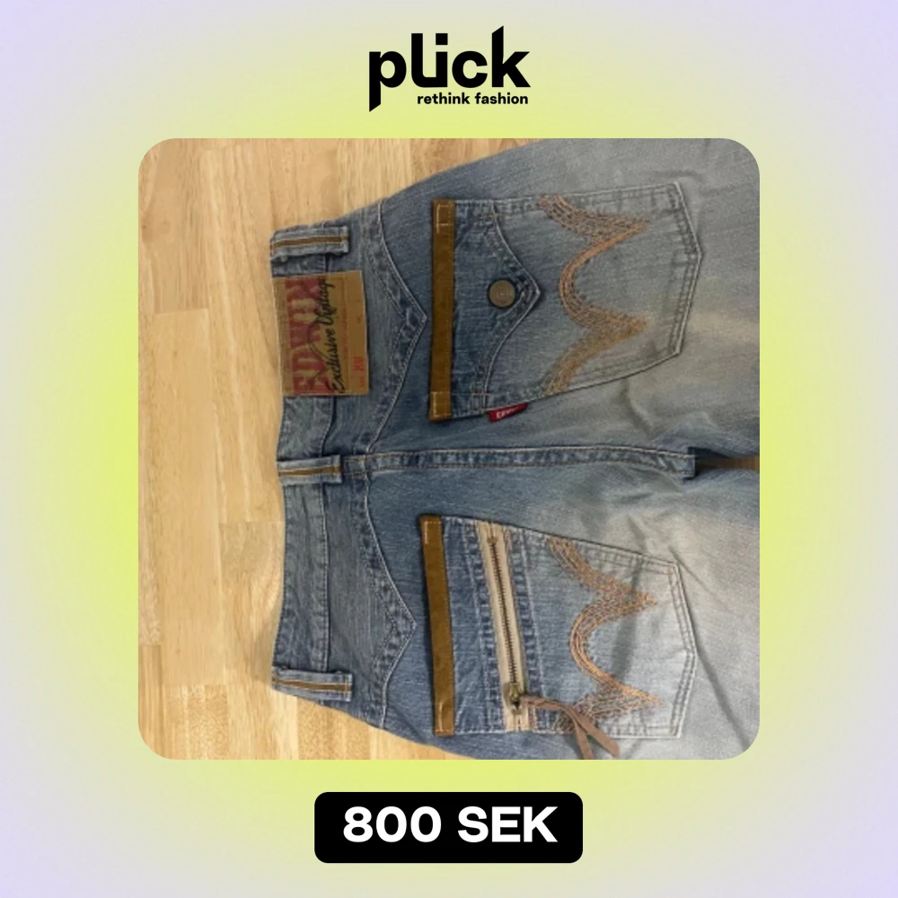 Säljer ett par snygga blå jeans från Edwin. De har en cool vintage look med slitningar och detaljer i brunt. Jeansen har en dragkedja på bakfickan och en knapp på den andra bakfickan. Perfekta för en avslappnad och stilren look!