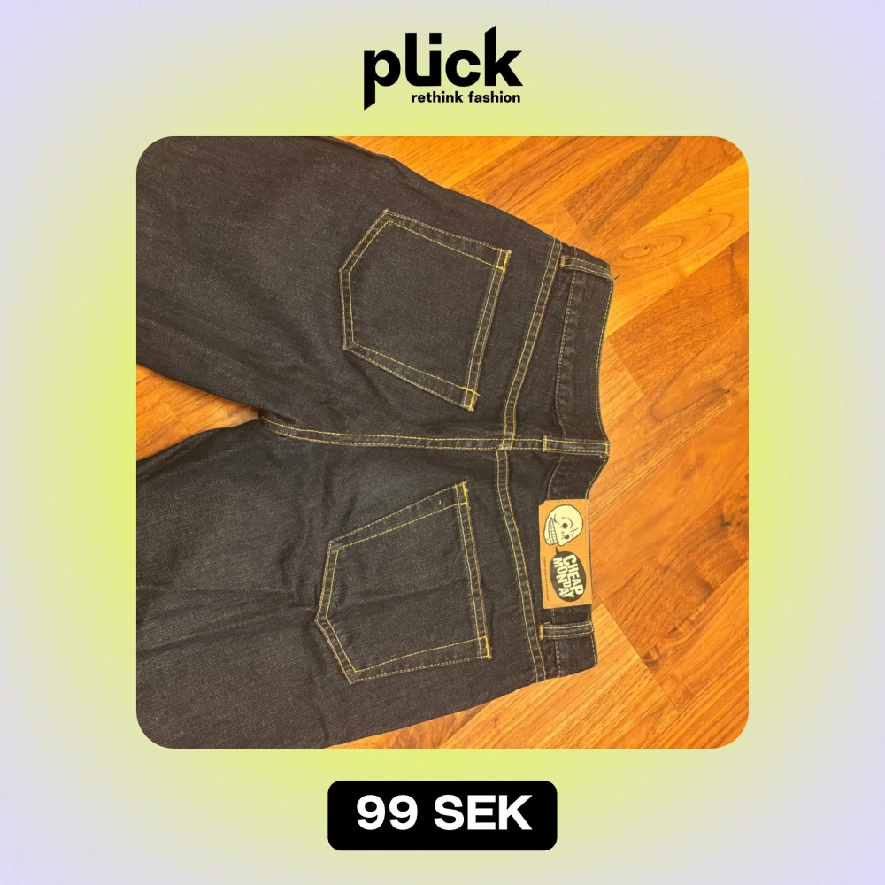 Snygga mörkblå jeans från Cheap Monday med klassisk femficksdesign och kontrasterande sömmar som är i en orange/gul nyans. Passar en S och är mycket långa i benen.