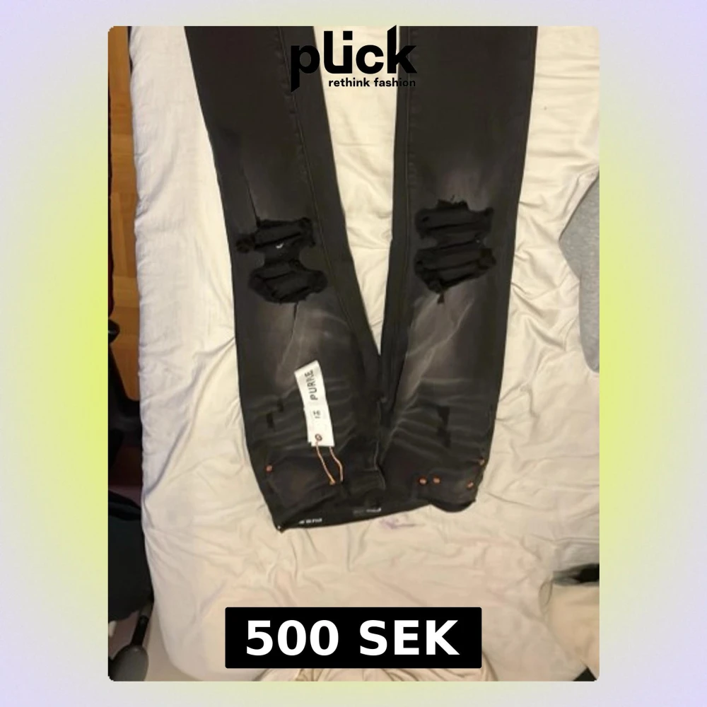 Säljer ett par svarta jeans från Purple Brand i storlek 31. Byxorna har stora ripped detaljer över knäna och klassiska nitar vid fickorna. Snygg streetstil med smal passform och trendiga slitningar.