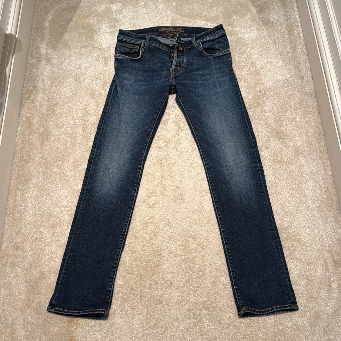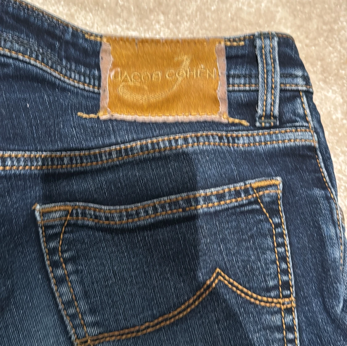 Snygga blå jeans från Jacob Cohen, tillverkade i Italien. De har en klassisk straight passform och är perfekta för en stilren look. Jeansen har en knappgylf och femficksdesign.