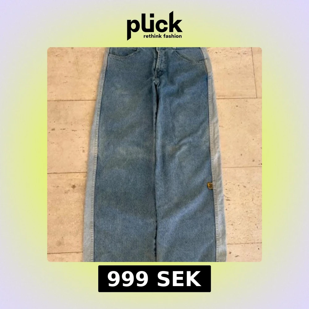 Säljer ett par ljusblå jeans från Anvil med bred passform och cool gator-patch på bakfickan. Jeansen är tillverkade i 100% bomull och har klassisk femficksdesign. Perfekta för dig som gillar retrovibbar och unika detaljer.