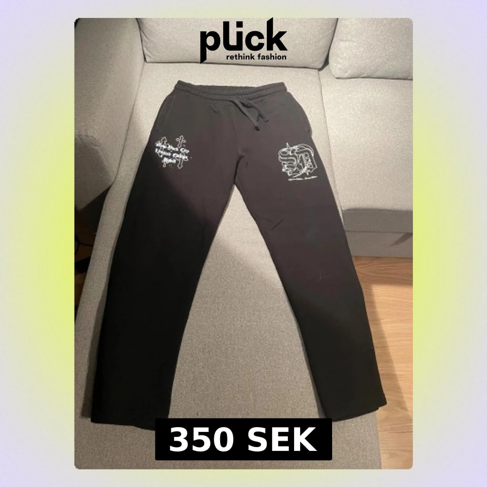 Svarta mjukisbyxor med tryck i vitt och ljusblått på båda benen. Ena sidan har texten 'New York City Limited Edition USA' med kors, andra sidan har ett stort S och D med stjärnor. Byxorna har snörning i midjan och är riktigt sköna för chill eller streetwear.