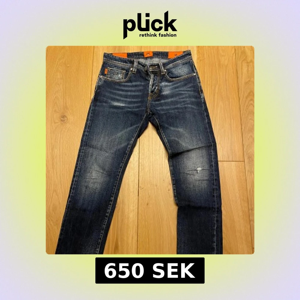 Säljer ett par mörkblå jeansbyxor med orange detaljer i midjan och klassisk femficksdesign. Jeansen har en lätt tvättad look och raka ben. Perfekta för dig som gillar en tidlös stil.