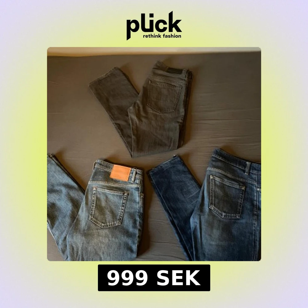 Säljer tre par jeans i olika färger: ett par ljusblå från Acne Studios med klassisk läderpatch, ett par mörkblå Filippa K och ett par grå j.lindeberg jeans. Alla har raka/slim ben. Nytt värde på alla 6698:-. Mitt pris 999:-. Hör av dig vid minsta lilla fråga😊 4 nya plagg ligger ute!