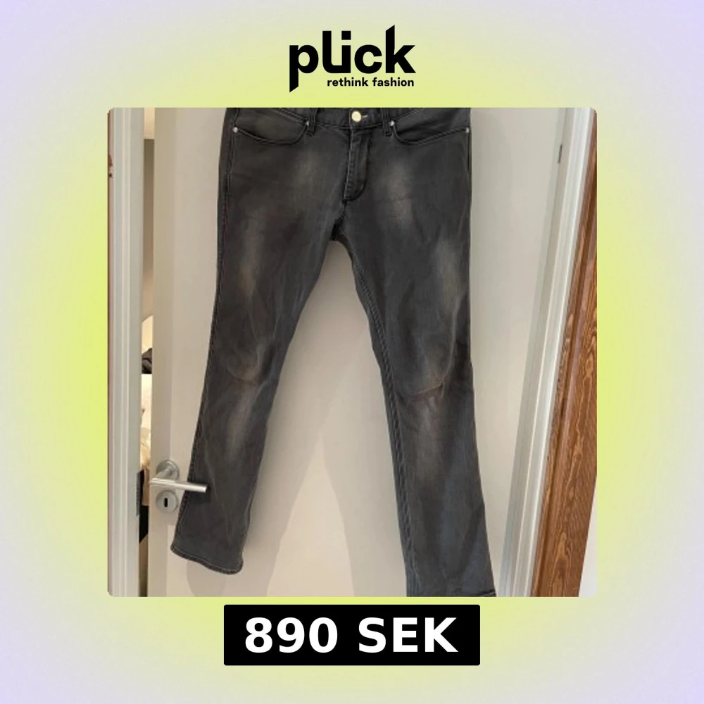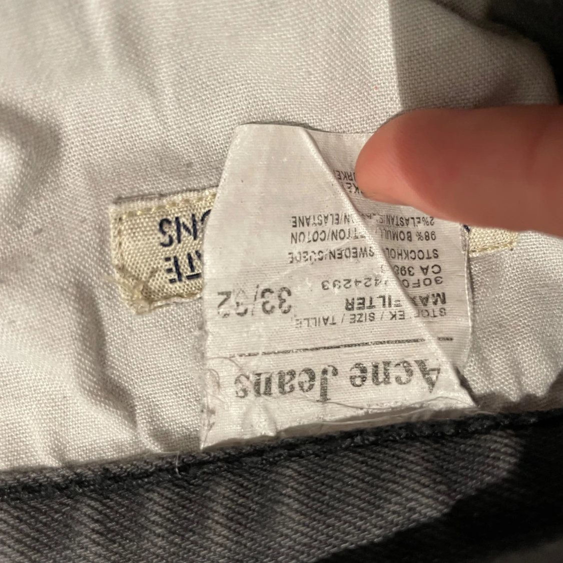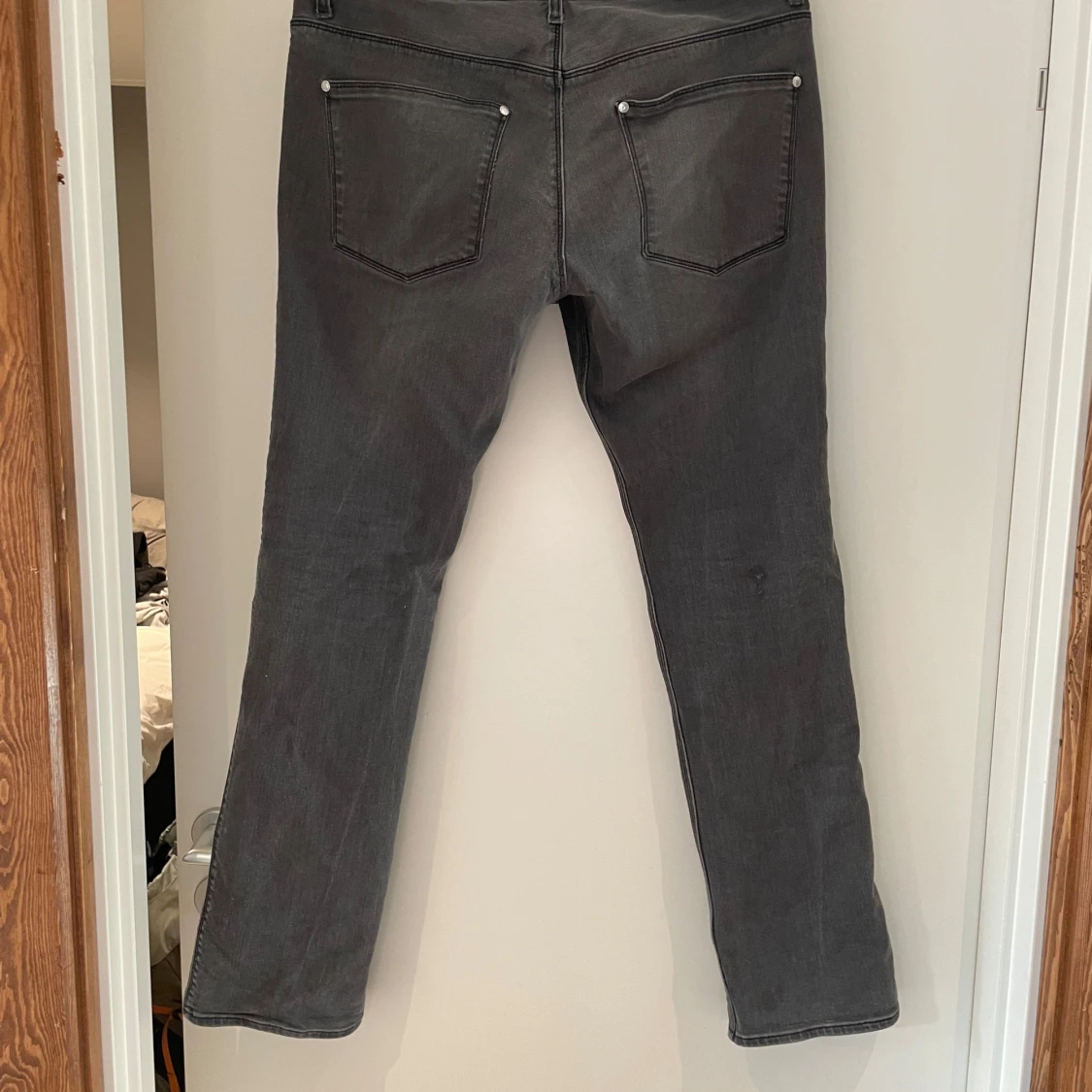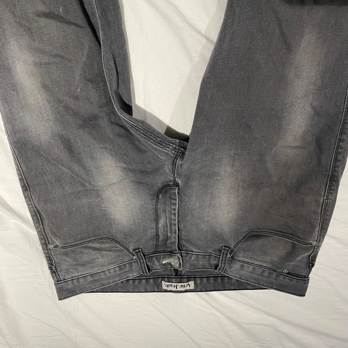 Säljer ett par gråa jeans från Acne Jeans i rak modell. Jeansen har klassisk femficksdesign, silverfärgade nitar och knapp, samt diskret tvättad look. Materialet är bomull med lite stretch för extra komfort. Perfekta för en clean och avslappnad stil. 33/32 men funkar för 32/32