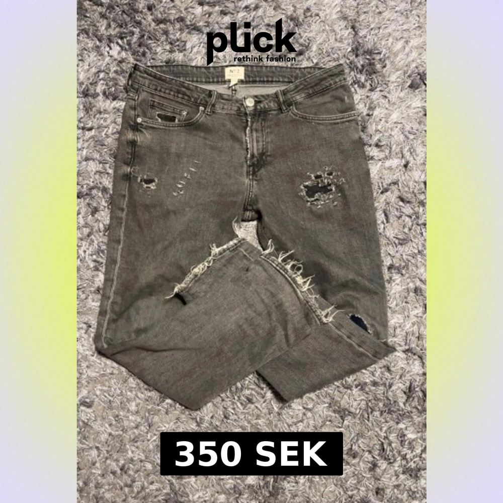 Grå jeans med regular fit, modell N°2. Byxorna har slitna detaljer, lagade hål och patchar.