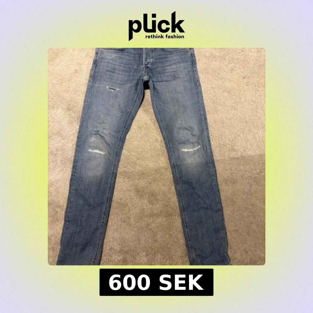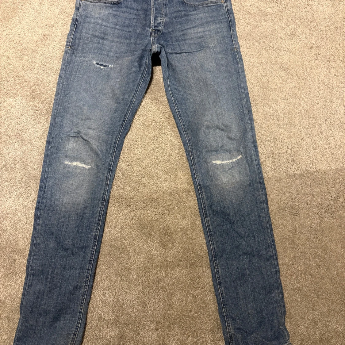 Säljer ett par blå skinny jeans i storlek 32/34 med slitna detaljer på knäna. Jeansen har klassisk femficksdesign och är tillverkade i mjukt denimtyg som sitter tajt längs benen. Perfekt för dig som gillar en smal siluett och lite sliten look.