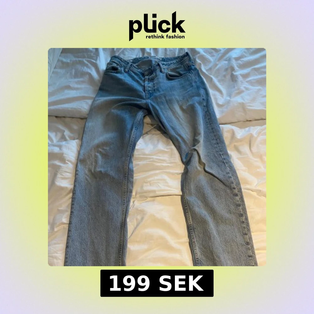 Säljer ett par ljusblå jeans i loose fit-modell. Byxorna har klassisk femficksdesign, knappgylf och raka ben. Perfekt för dig som gillar avslappnad stil och vill ha bekväma jeans med lite extra utrymme.