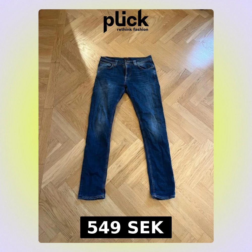 Snygga blå jeans från Nudie Jeans Co med klassisk femficksdesign och orangea sömmar på bakfickorna. Jeansen har slim passform och normal midja, tillverkade i slitstarkt denim. Perfekta för dig som gillar stilrena och tidlösa jeans. Hör av er vid frågor