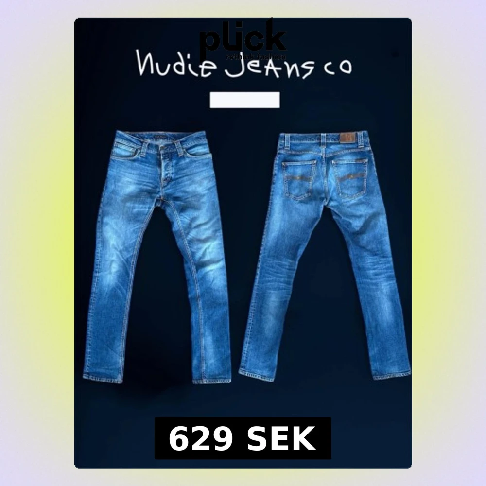 Tjo säljer ett par otroligt snygga Nudie Jeans!!! Nästan nya, super fräscha!!! ||| Modell: Grim Tim,Midja: 41 cm, Innerben: 89 cm Lårbredd: 21cm, Fotöppning: 18cm Hör av dig vid frågor💫