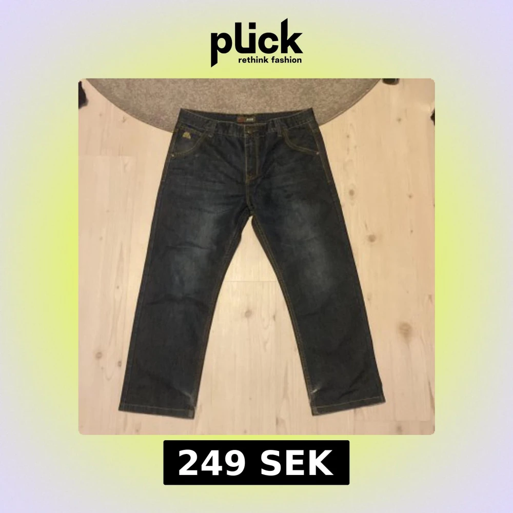 Snygga mörkblå jeans från Jeep med gul broderad logga på fickan och bakficka. Klassisk femficksmodell med kontrastsömmar och läderpatch bak i midjan. Raka ben och normal passform, perfekta till vardagslooken.