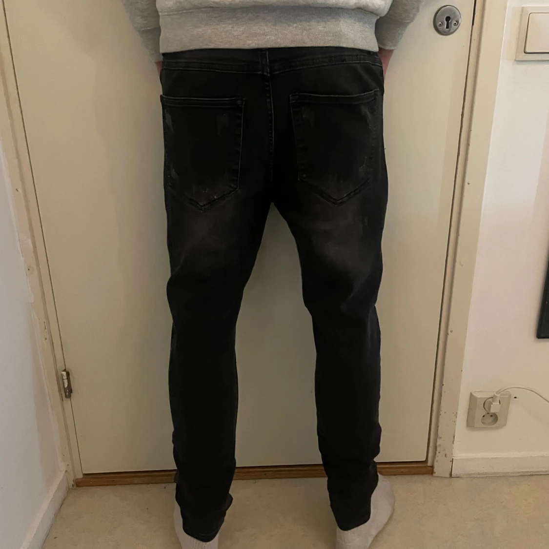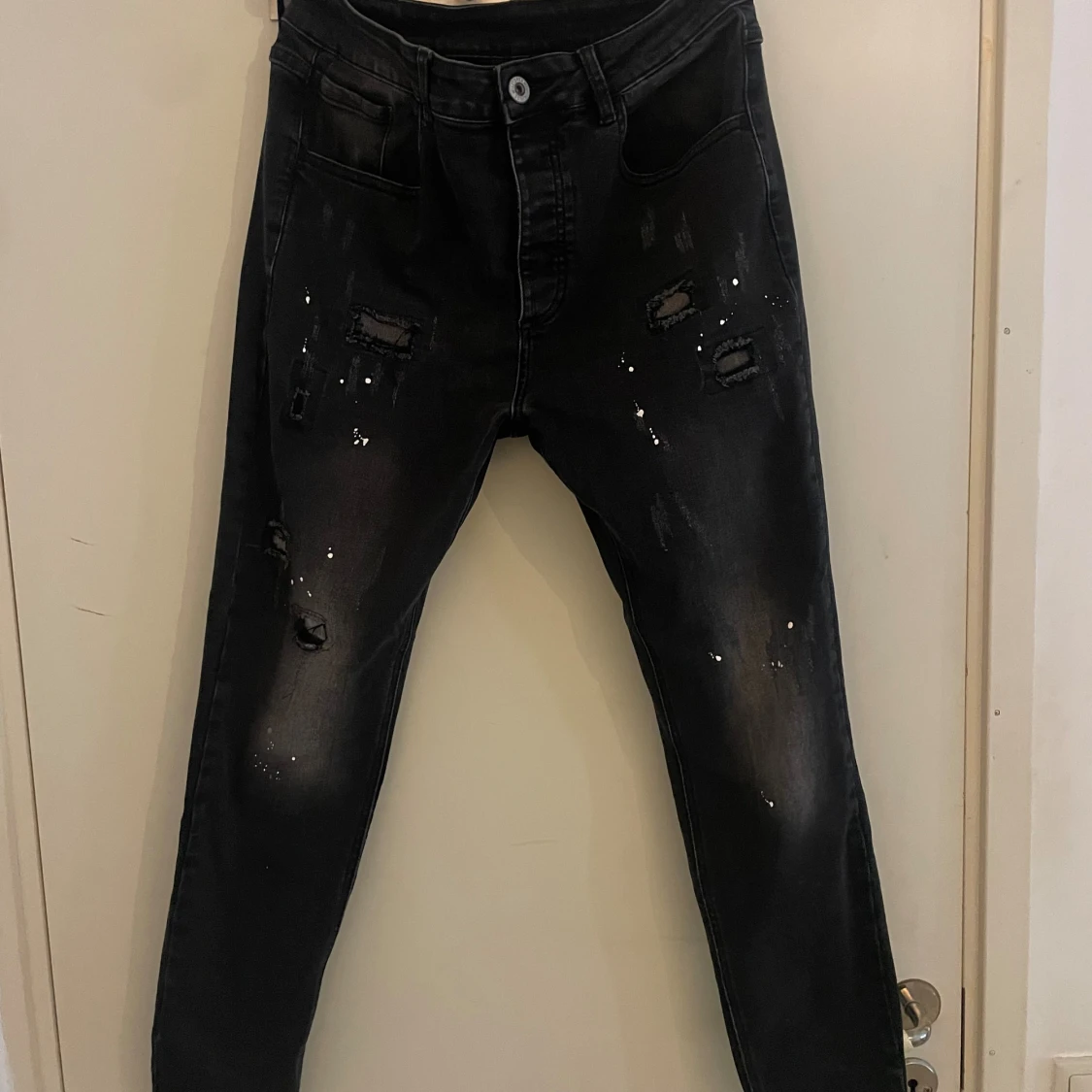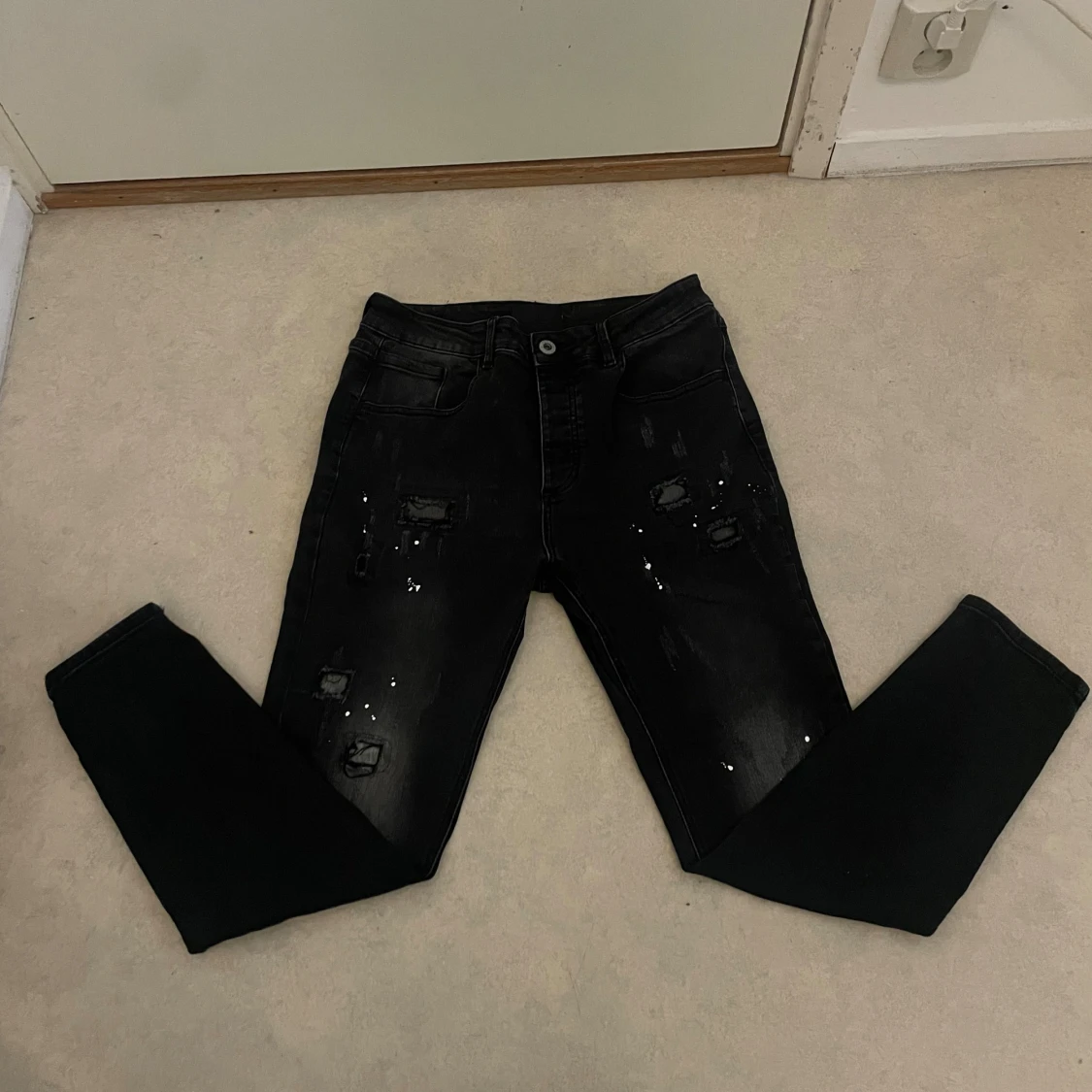 Svarta jeans med skinny fit och coola slitningar samt vita färgstänk på framsidan. Jeansen har klassisk femficksdesign och knappgylf. Materialet är stretchigt denim som sitter tajt längs benen och ger en modern look. Storlek 32/31
