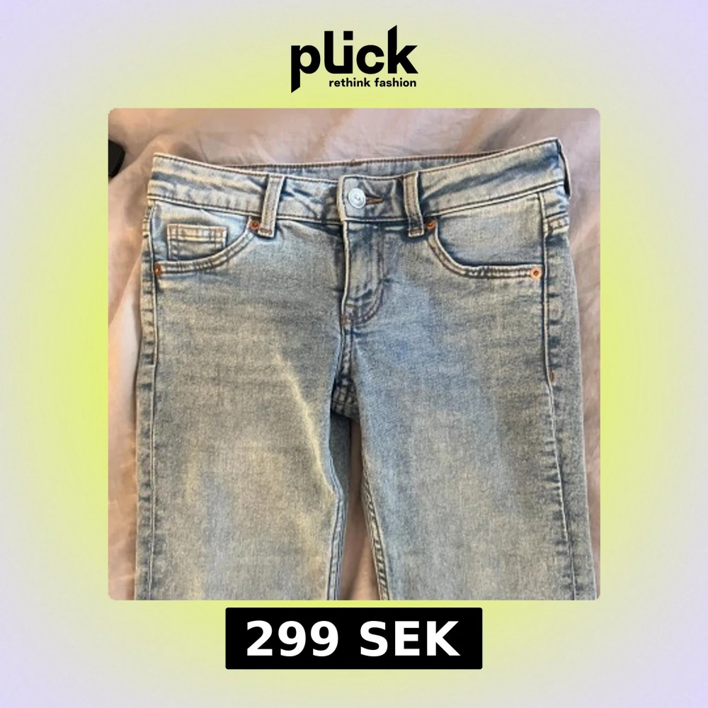 Säljer ett par ljusblå bootcut jeans. Byxorna är ultra lowwaist och stängs med knapp och dragkedja. Perfekta till vardags och enkla att matcha med olika toppar.