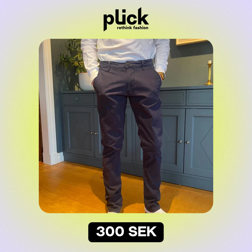 Snygga mörkblå chinos från Selected Homme. De har en normal passform och är tillverkade i ett bekvämt bomullsmaterial. Perfekta för en stilren look med knappar och dragkedja i midjan.