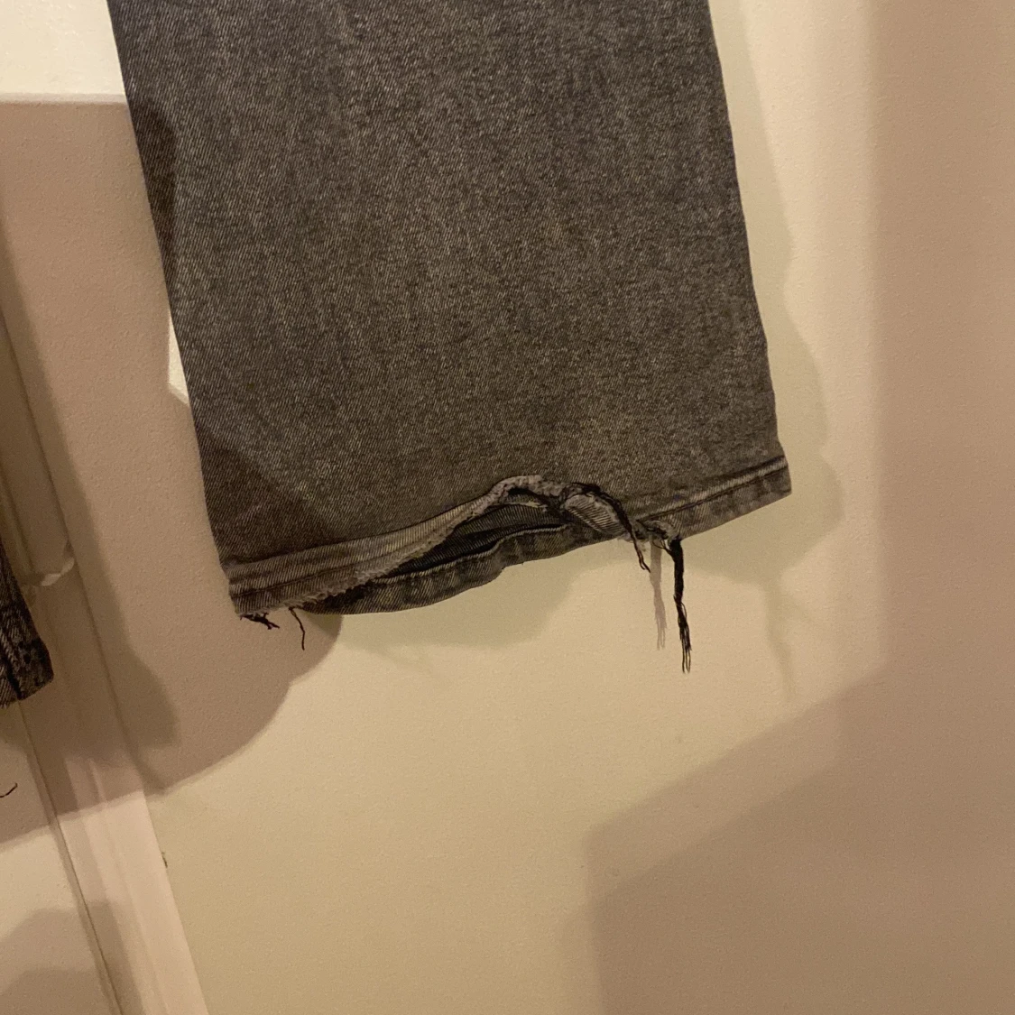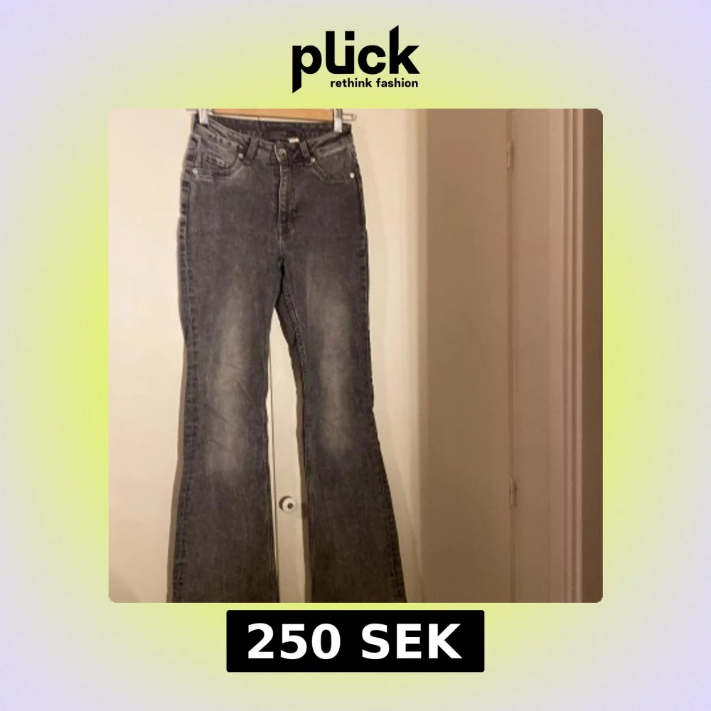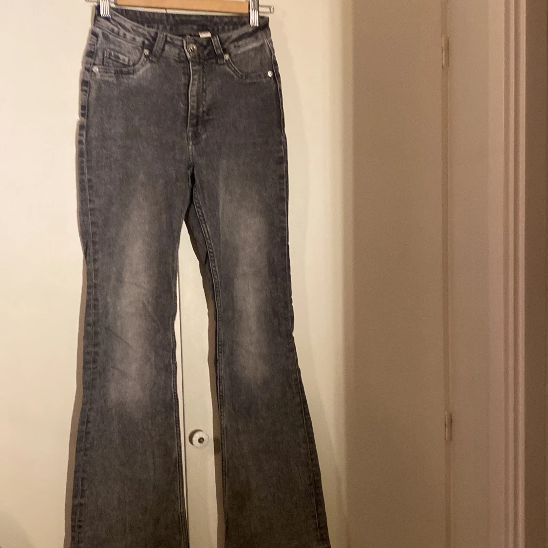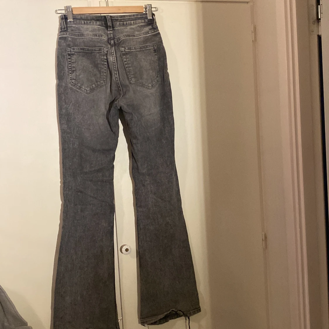 Grå jeans från Divided i bootcut-modell med hög midja. Jeansen har en tvättad look och råa, fransiga benslut för en cool vibe. Klassisk femficksdesign och tillverkade i denim. Perfekta för dig som gillar en avslappnad men trendig stil. Highwaist modell.