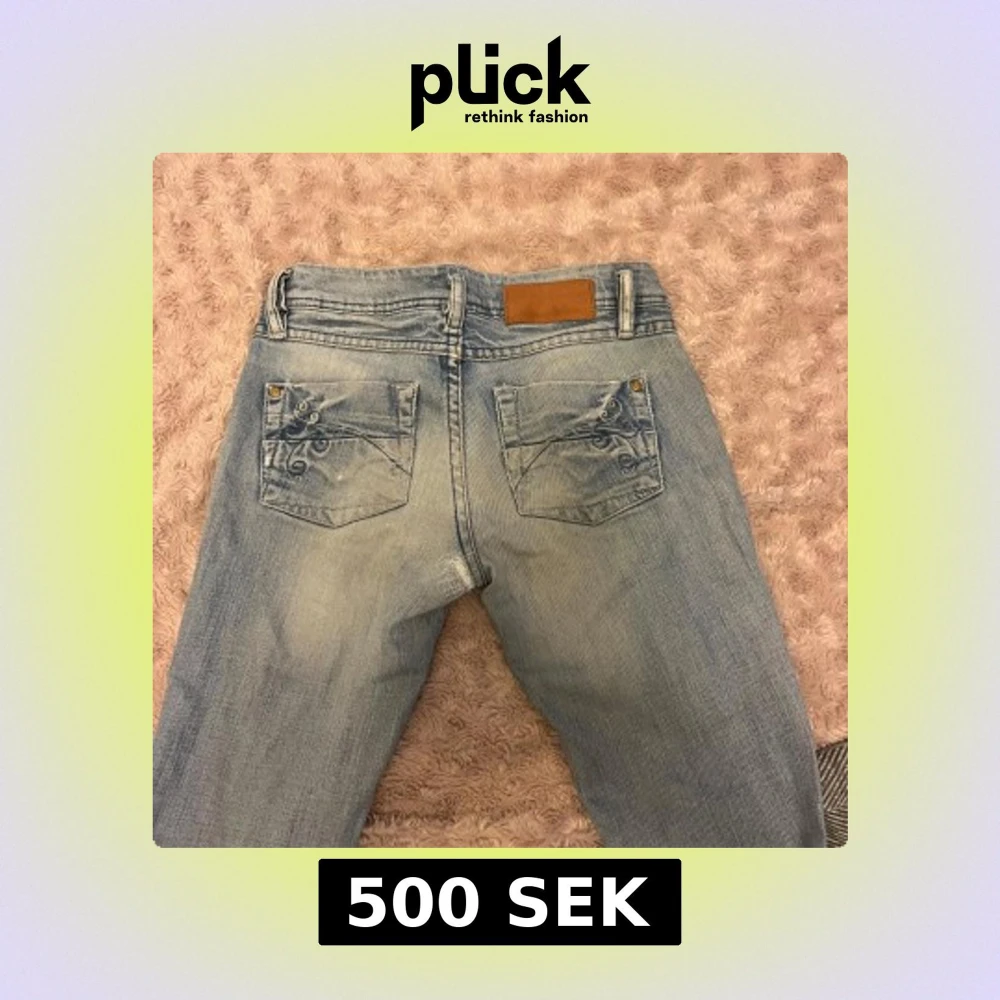 Säljer ett par ljusblå jeans med bootcut-modell och snygga broderade detaljer på bakfickorna. Jeansen har låg midja och är sjukt snygga. Säljer för att de tyvärr inte passar mig längre:( de har ett håll på baksidan som jag har sytt igen men det är inget som syns när man har de på sig!