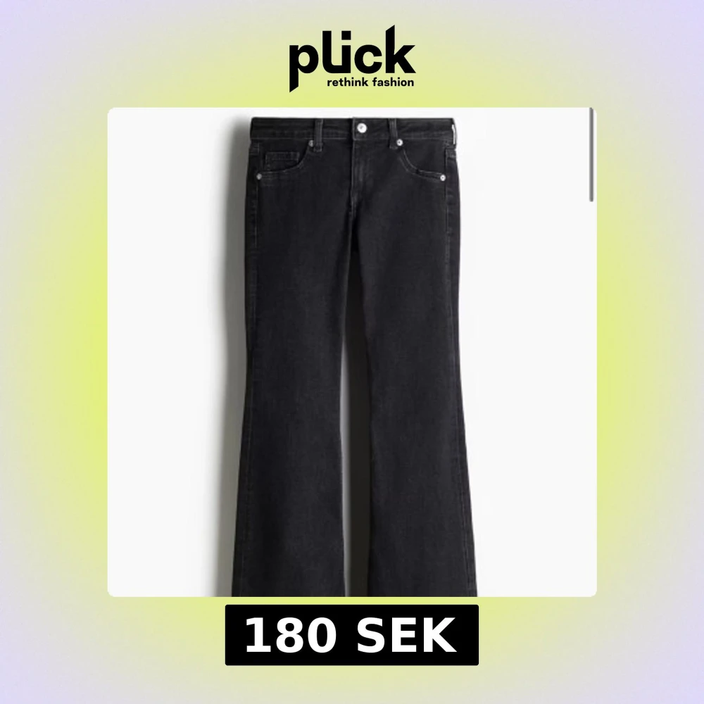 Snygga svarta bootcut jeans med klassisk femficksdesign och knappgylf. Perfekta för en stilren look med en touch av retro. Passar bra till både sneakers och klackar.