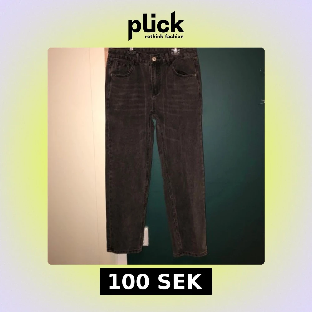 Säljer ett par svarta jeans med rak passform och klassisk femficksdesign. Jeansen har en något tvättad vintage-look och är tillverkade i kraftigt denimtyg. Perfekta för dig som gillar en enkel och tidlös stil.