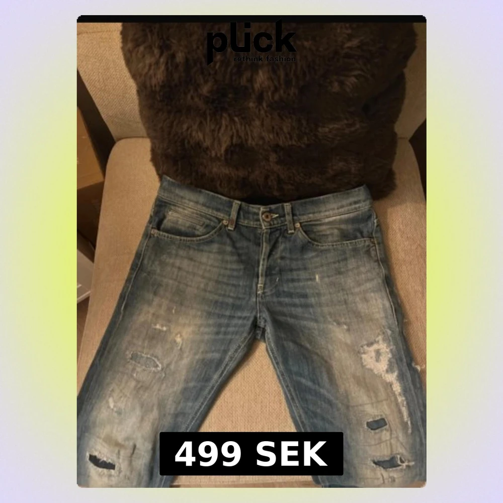Säljer ett par blå skinny jeans från DonDup med slitna detaljer och hål på benen för en cool, edgy look. Jeansen har klassisk femficksdesign, knapp och dragkedja i midjan samt skinny fit som sitter tajt längs benen. Perfekt för dig som gillar streetstyle.