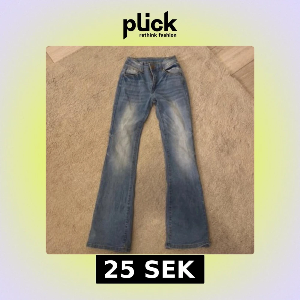 Snygga blå bootcut jeans med klassisk femficksdesign och ljusa slitningar framtill och baktill. Jeansen har normal passform och stängs med knapp och dragkedja. Perfekta för en avslappnad och trendig look. små i storleken